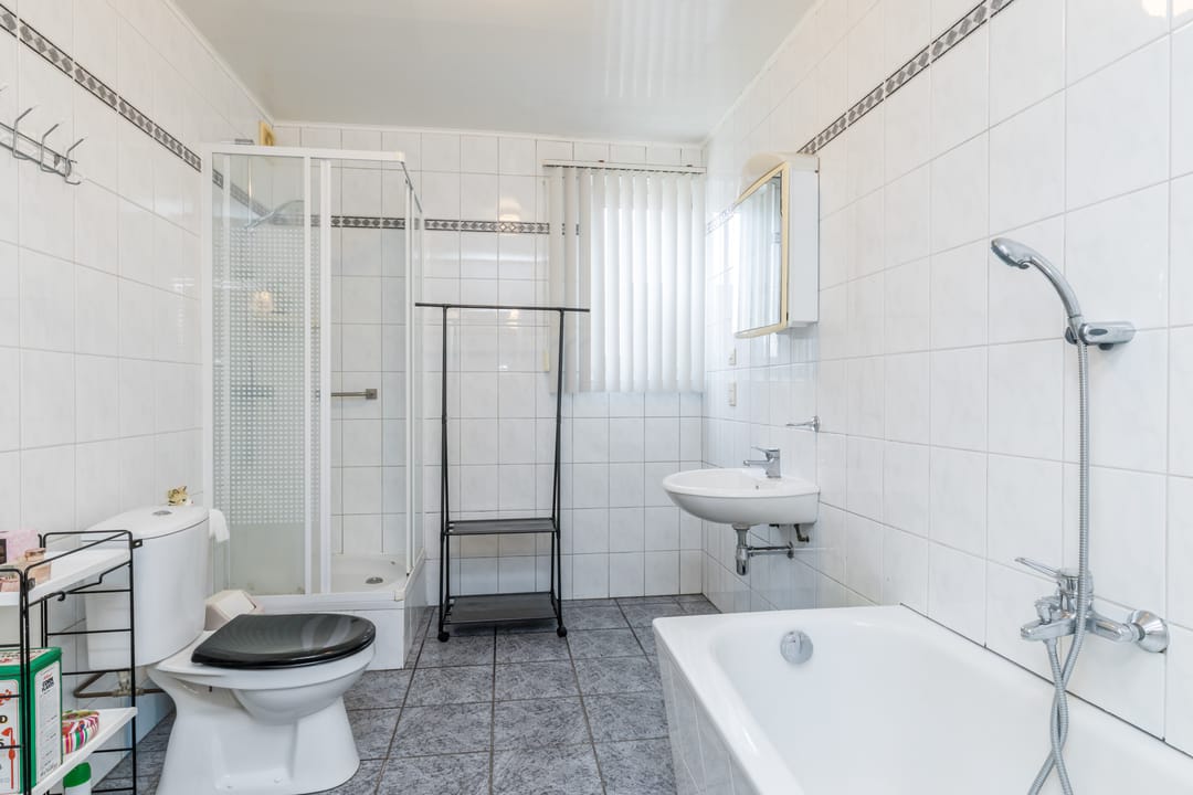 Vanuit de hal heeft men verder toegang tot de slaapkamer op de begane grond en tot een badkamer. De badkamer is voorzien van ligbad, douchecabine, toilet en wastafel