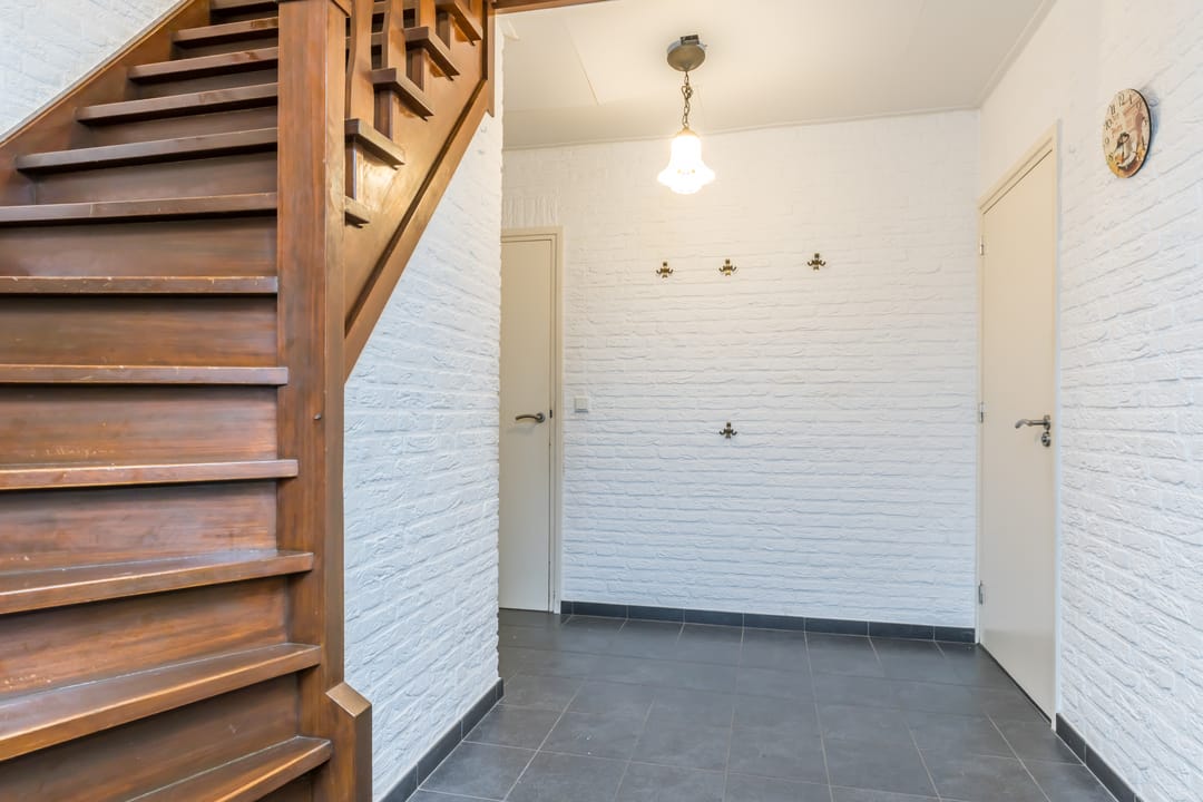 In de entreehal verder de trap naar de eerste verdieping, de toegang naar een toilet met fonteintje en de toegang naar de kelder. De kelder is nat vanwege optrekkend grondwater.
