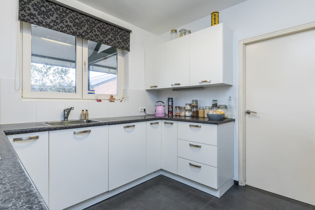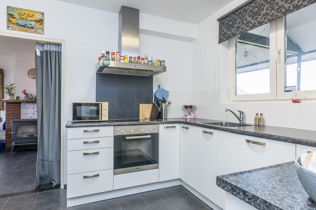 Aangrenzend aan de eetkamer ligt de halfopen keuken. De keuken is betegeld en voorzien van een keukenblok met vaatwasser, combi-oven, gootsteen, kookplaat en wasemkap.