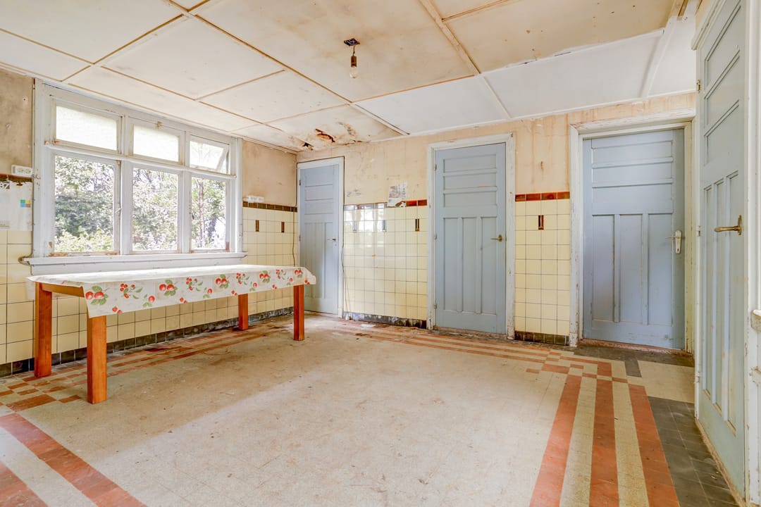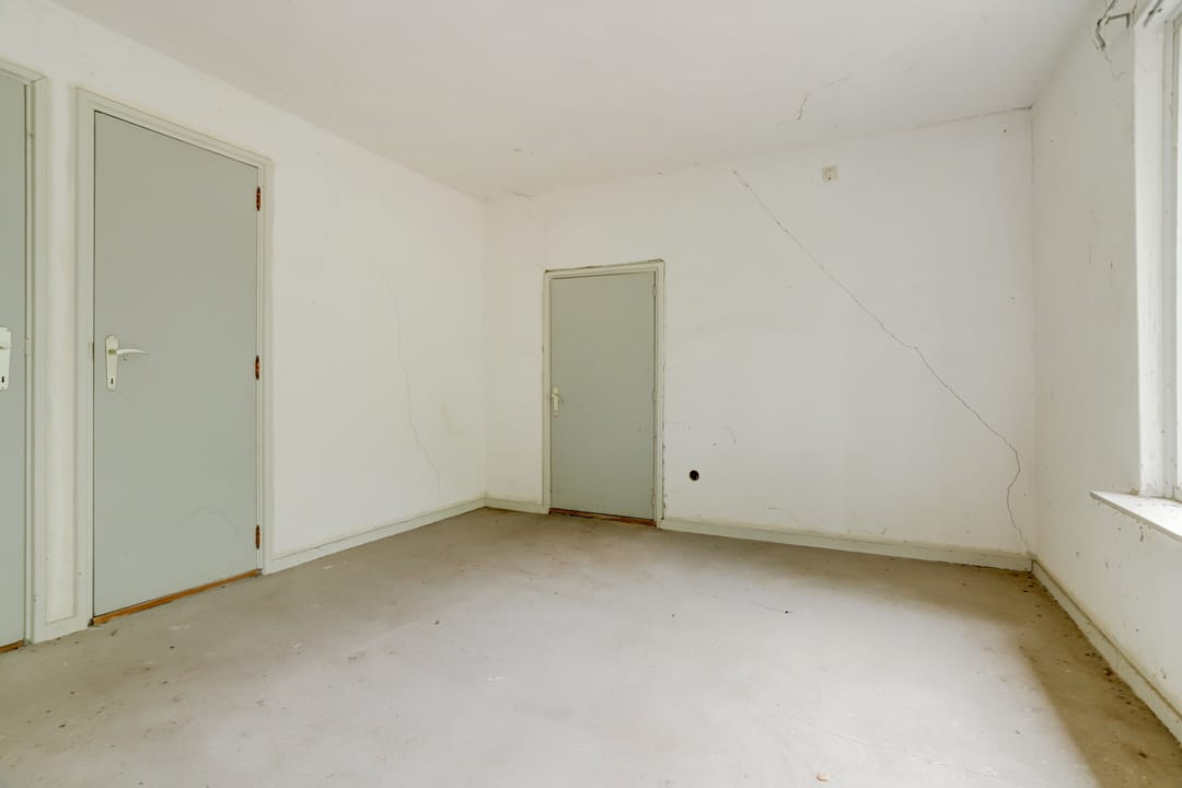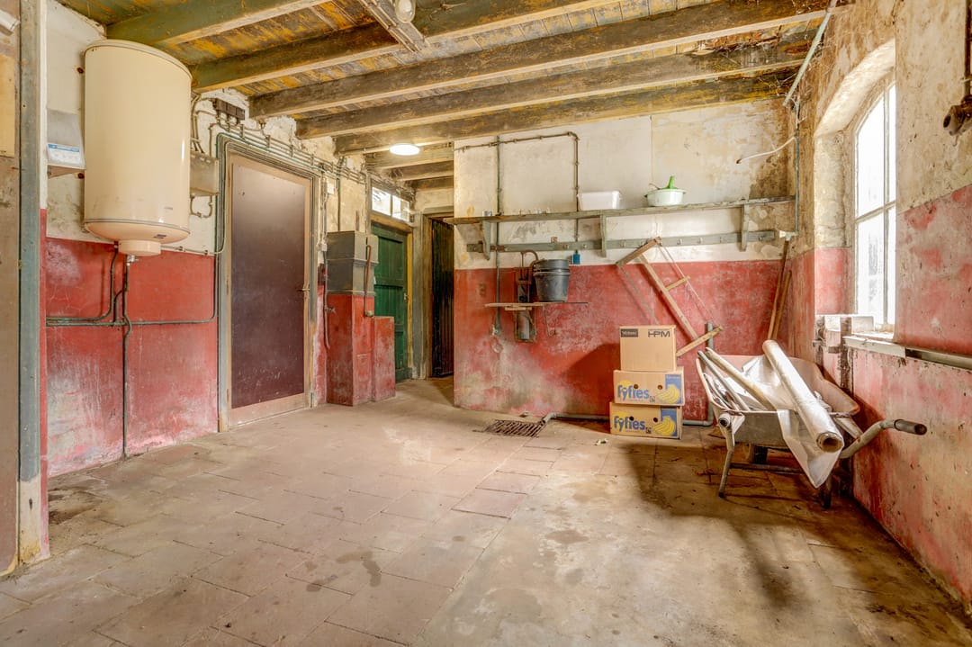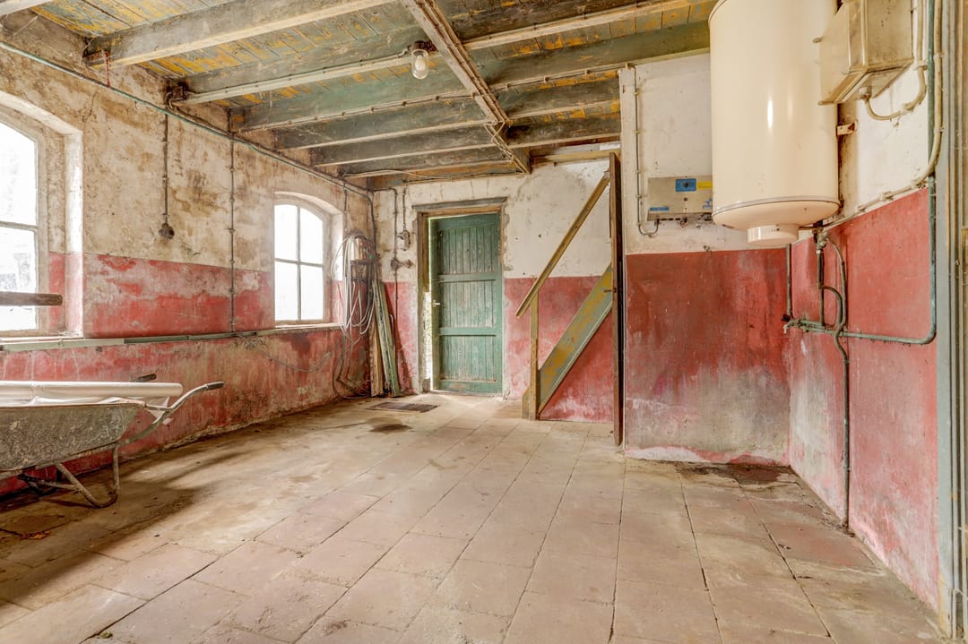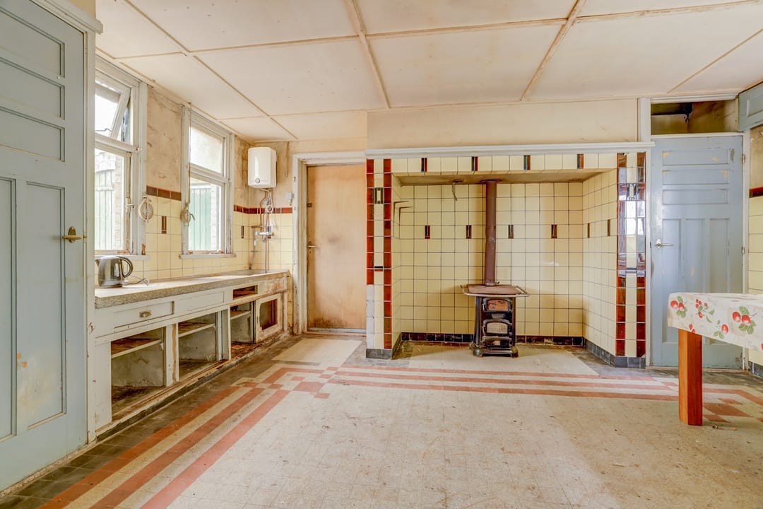 De woonkamer, gelegen aan de voorzijde van de woning, is circa 16 m² groot en voorzien van praktische vaste kasten. Deze ruimte staat in open verbinding met de aangrenzende eetkamer, wat zorgt voor een lichte leefruimte. Aansluitend aan de woon- en eetkamer bevindt zich een multifunctionele ruimte die verschillende mogelijkheden biedt. Vanuit deze ruimte heb je via een klein portaal toegang tot de keuken. Ook biedt de multifunctionele ruimte een tweede toegang tot de eetkamer. De woonkeuken is royaal opgezet met bijna 20 m² aan ruimte. Er is een zij-entree aanwezig, een eenvoudige keukenopstelling en een houtkachel. Vanuit de keuken is de kelder bereikbaar, een ruimte van circa 15 m², ideaal voor het bewaren van etenswaren of het creëren van een wijnkelder. Achter de keuken ligt de bijkeuken van eveneens circa 20 m². Ook deze ruimte is multifunctioneel te gebruiken en naar eigen inzicht in te richten. Vanuit hier heb je toegang tot zowel de achter- als zijentree, en bereik je direct de grote aangrenzende schuur met de voormalige veestal. Hier vind je ook een tweede vaste trap naar de verdieping. Deze trap komt uit op een aparte bovenverdieping boven de keuken en bijkeuken.