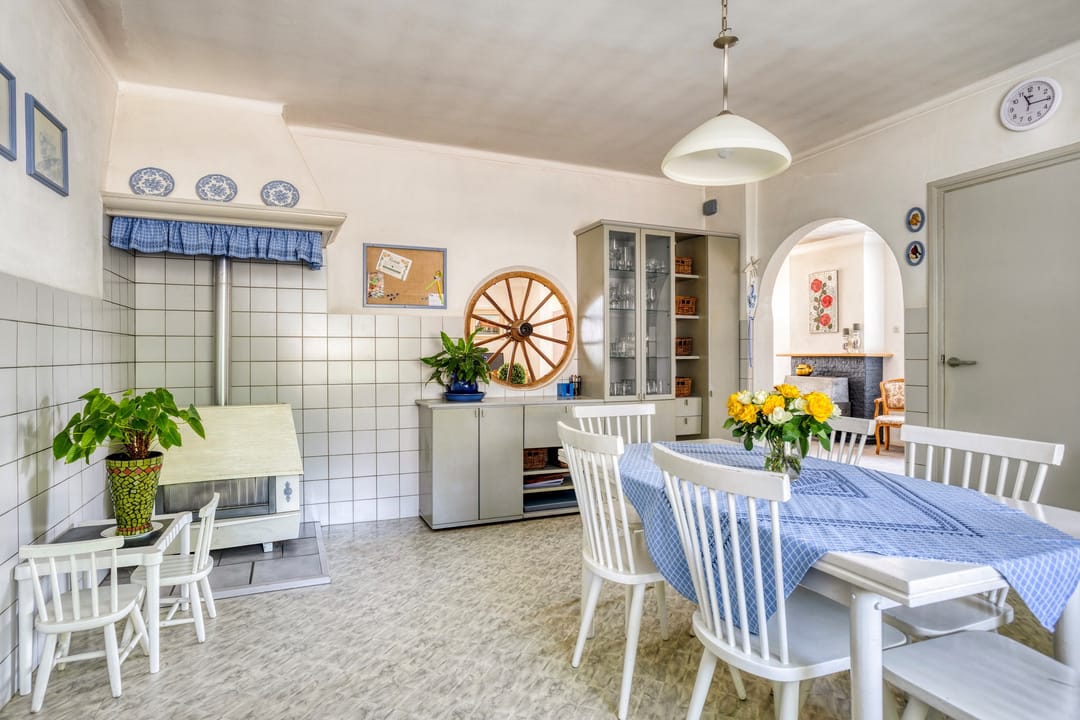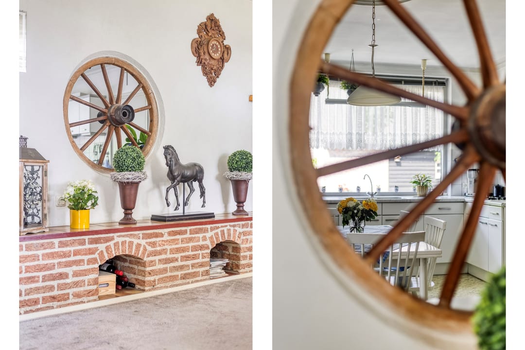 • dak beschoten met houten delen bij het woongedeelte en gedekt met gebakken pannen.
