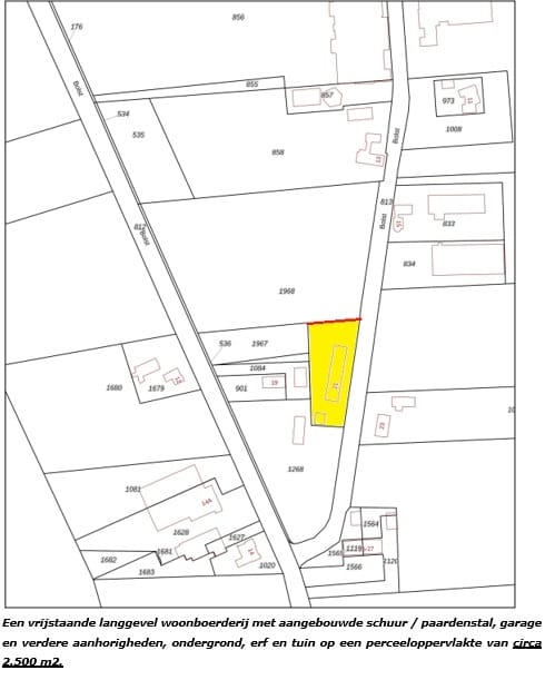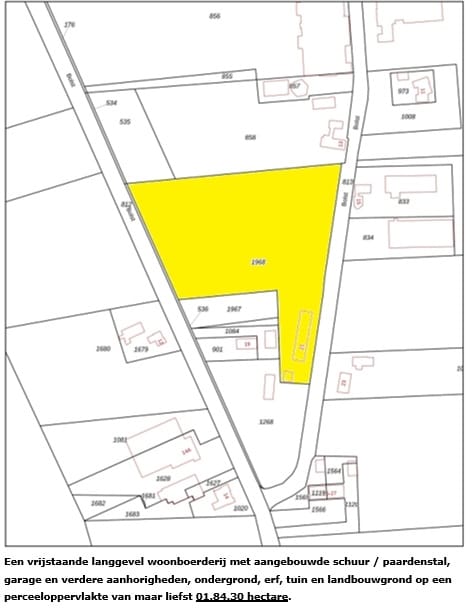 Vrijstaande langgevel woonboerderij met aangebouwde schuur / paardenstal, garage en landbouwgrond op een perceeloppervlakte van circa 2.500 m² (eventueel te koop met een perceeloppervlakte van 01.84.30 hectare).