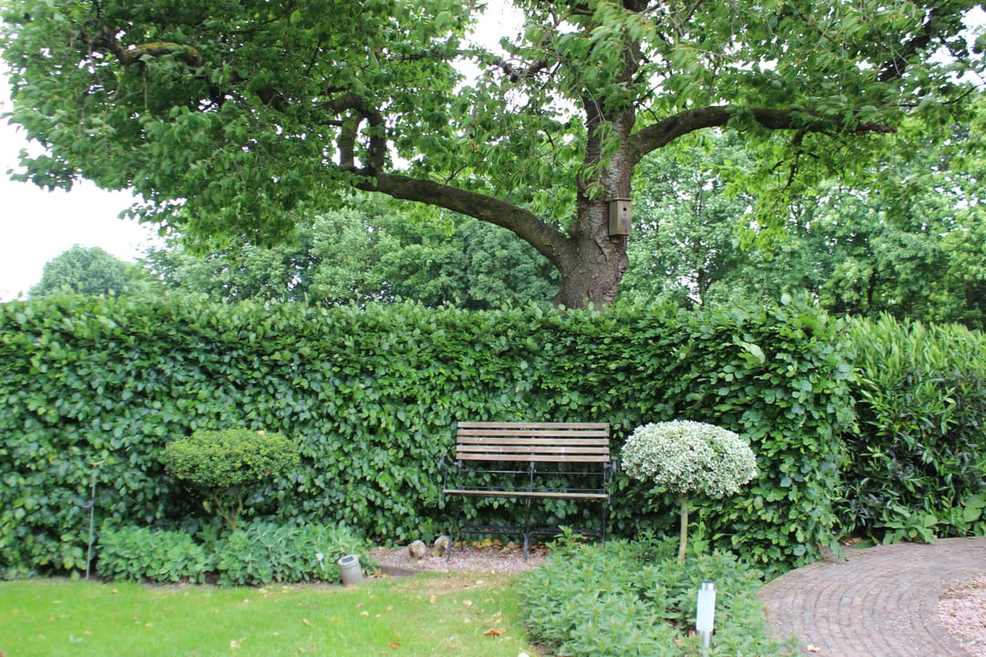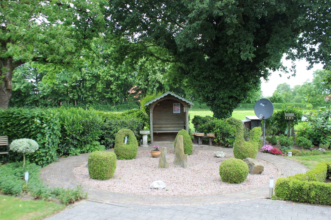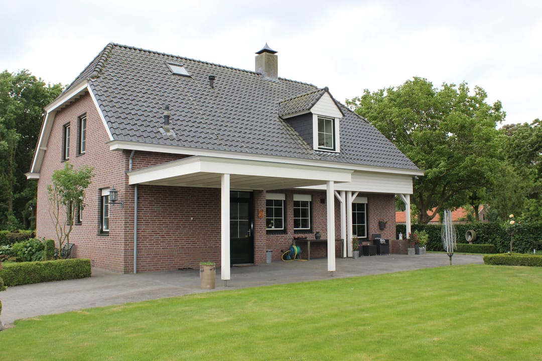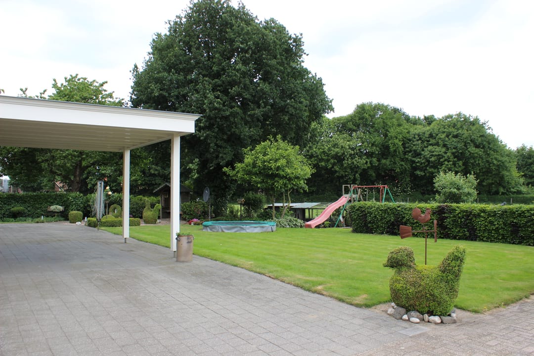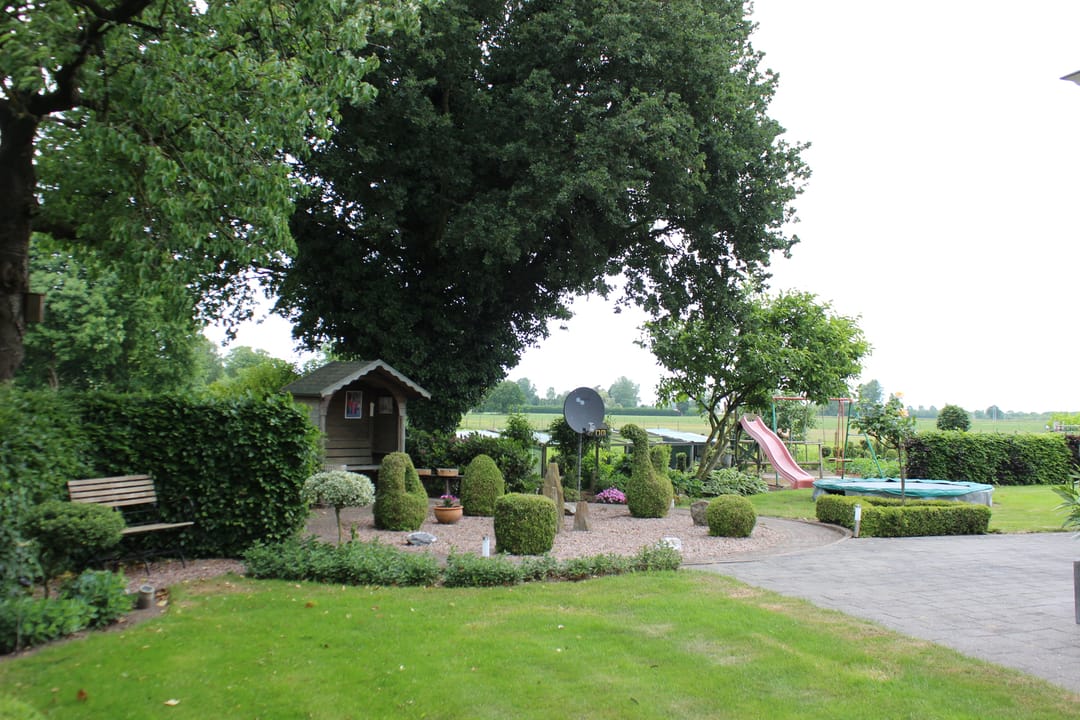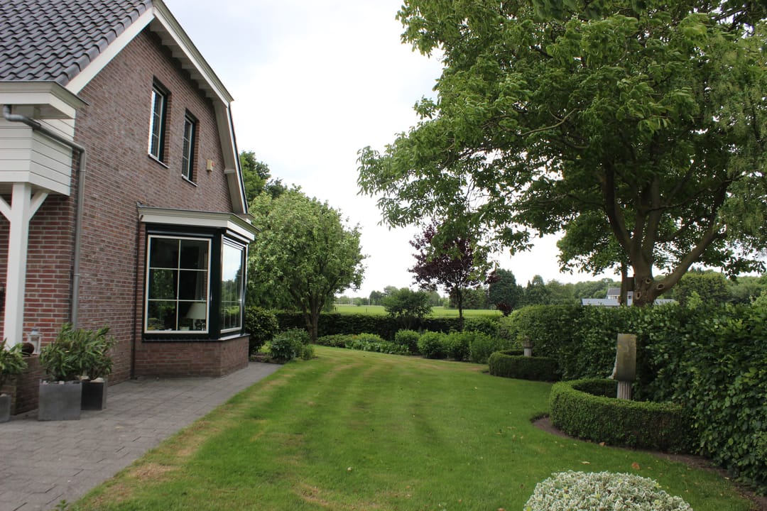 Mooie rondom gelegen tuin met gazon, diverse borders, meerdere terrassen en een fraaie oprijlaan met carport aan huis. Vanaf het terras heeft men werkelijk prachtig zicht over de landerijen. Aansluitend aan de achtertuin is een groot en geheel omheind stuk weiland gelegen.