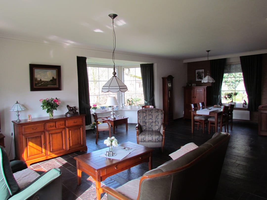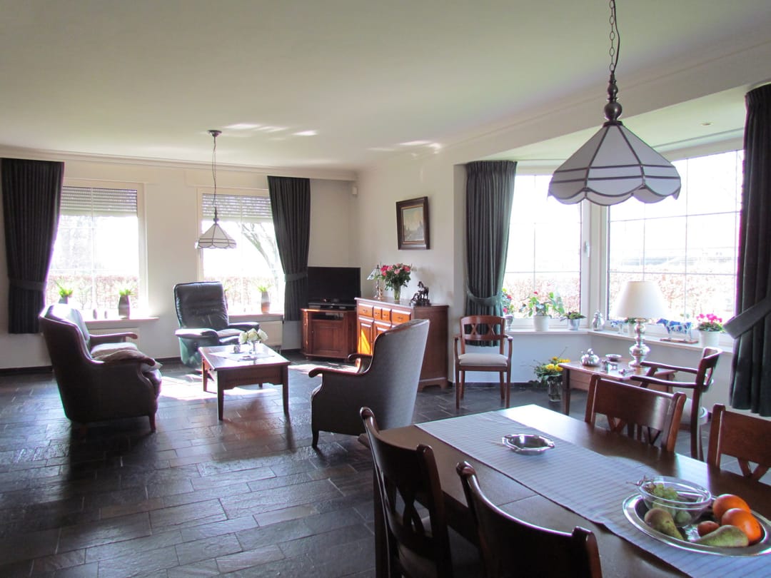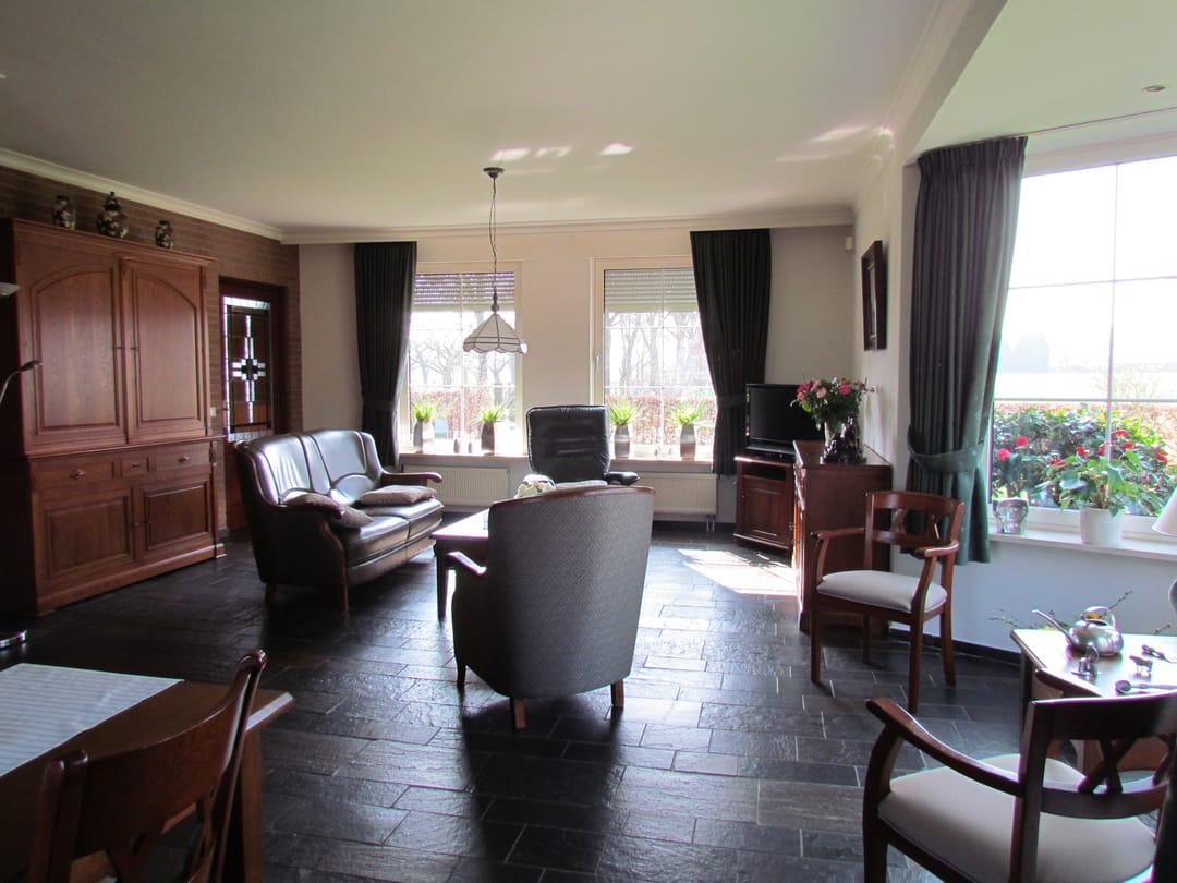 Oppervlak circa 42m². Woonkamer met fraaie erker. Woonkamer is afgewerkt met een leistenen vloer, stucwerkwanden en een stucwerkplafond. Vanuit de woonkamer en woonkeuken heeft men fraai zicht over de landerijen.