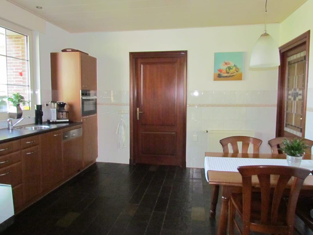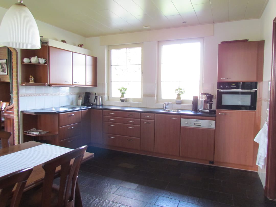 Oppervlak circa 15m². Woonkeuken met lichte keukeninrichting v.v. combimagnetron, koelkast, inductiekookplaat, afzuigkap, spoelbak, vaatwasser en volop kastruimte. De keuken is afgewerkt met een leistenen vloer, deels betegelde wanden en een MDF plafond.