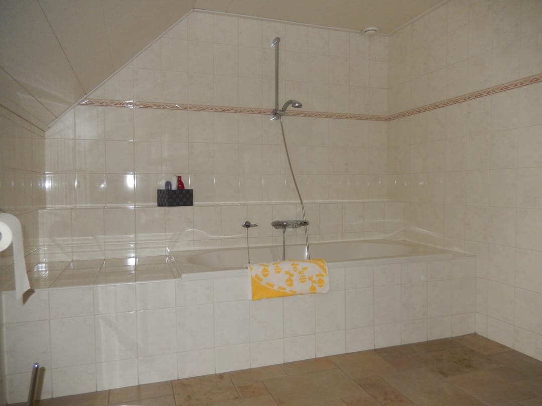 Oppervlak circa 10m². Geheel betegelde badkamer met dakkapel, vaste wastafel in meubel, hangcloset en een ligbad v.v. douchegarnituur.