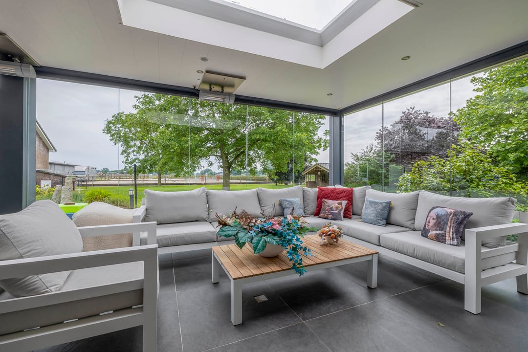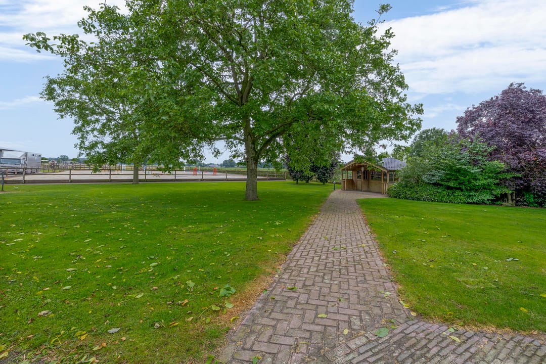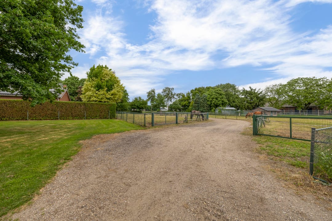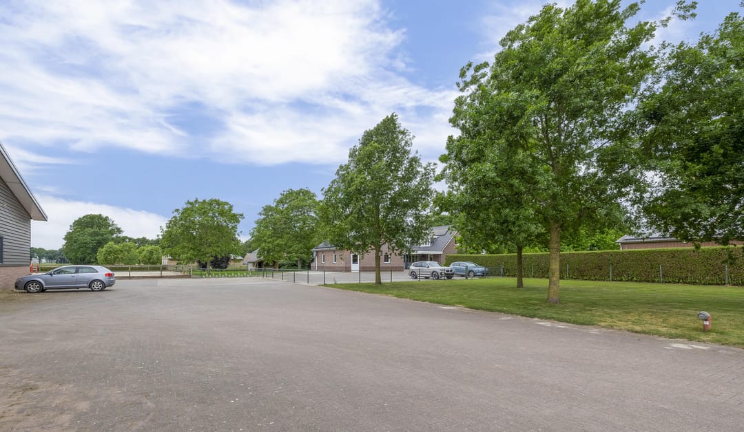 De tuin is voorzien van een royaal overdekt terras met glazen schuifwanden, zodat u het hele jaar door kunt genieten van het buitenleven. Vanuit het terras heb je een fraai uitzicht op de tuin en zelfs op de buitenpiste. Daarnaast is er een tuinhuis, een uitgestrekt gazon en diverse volwassen bomen en struiken aanwezig. Voor extra gemak beschikt de tuin over een beregeningsinstallatie. Het erf is grotendeels voorzien van betonklinkers. Een gedeelte, de weg tot aan de garage is afgewerkt met gebakken klinkers. Het deel vanaf de weg, naast de stal en tot aan de achterzijde van de stal is voorzien van gebroken asfalt. Er zijn 2 opritten aanwezig, er is een aparte oprit die toegang biedt tot de accommodatie.