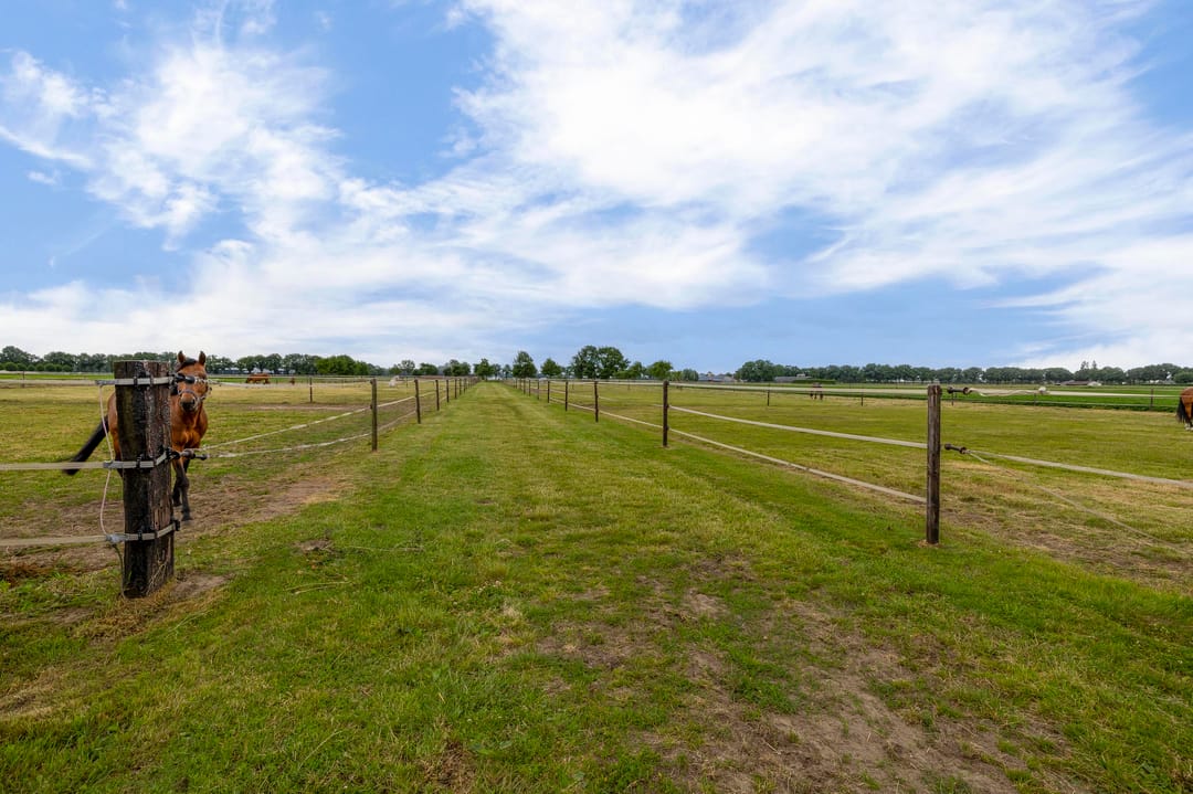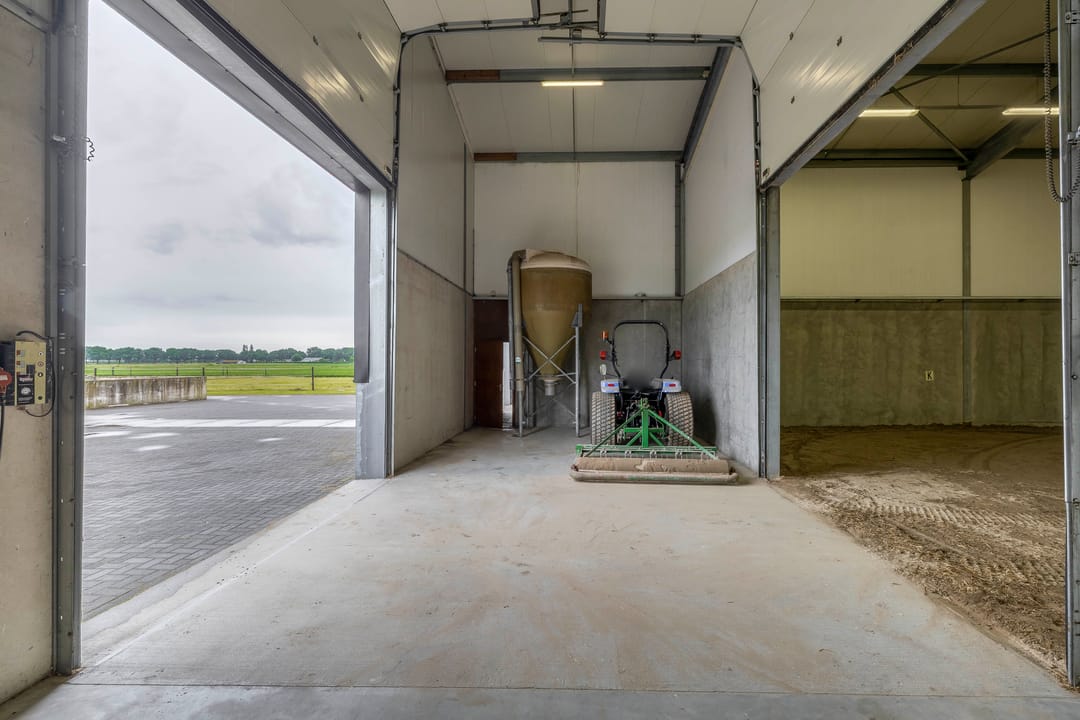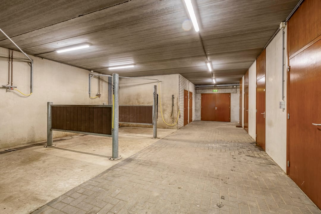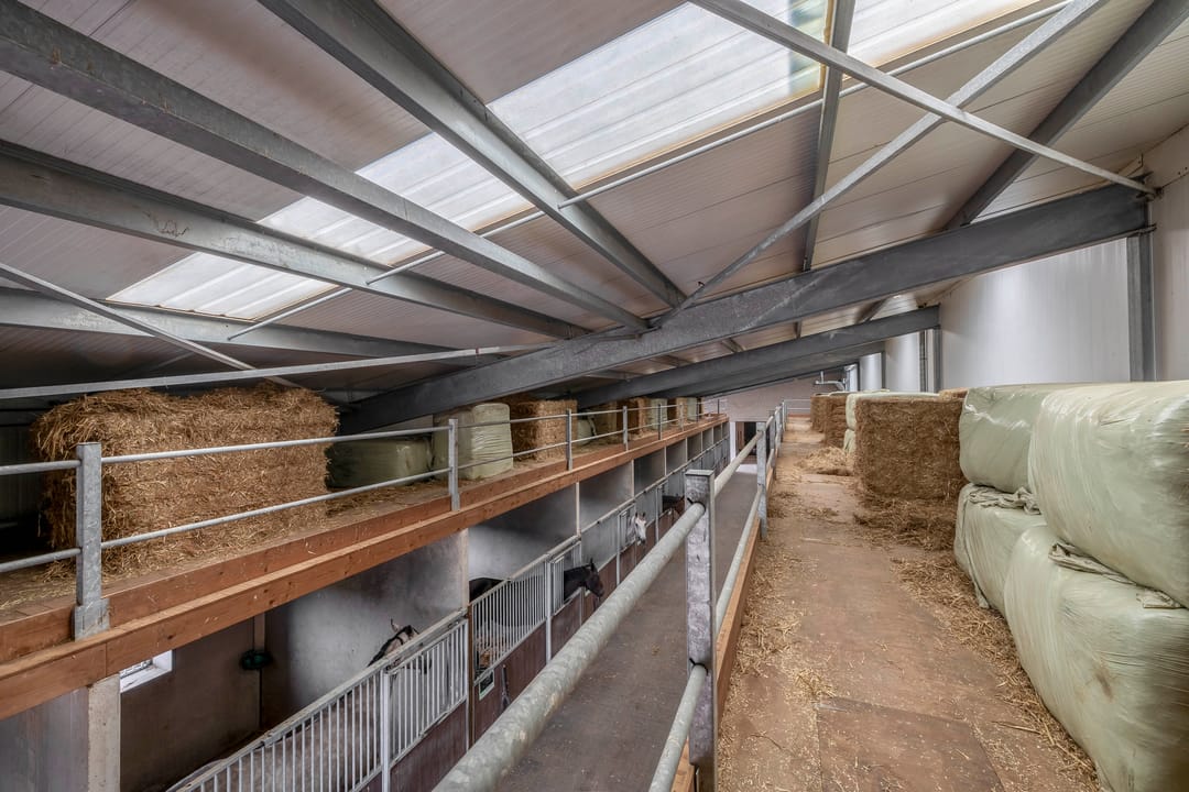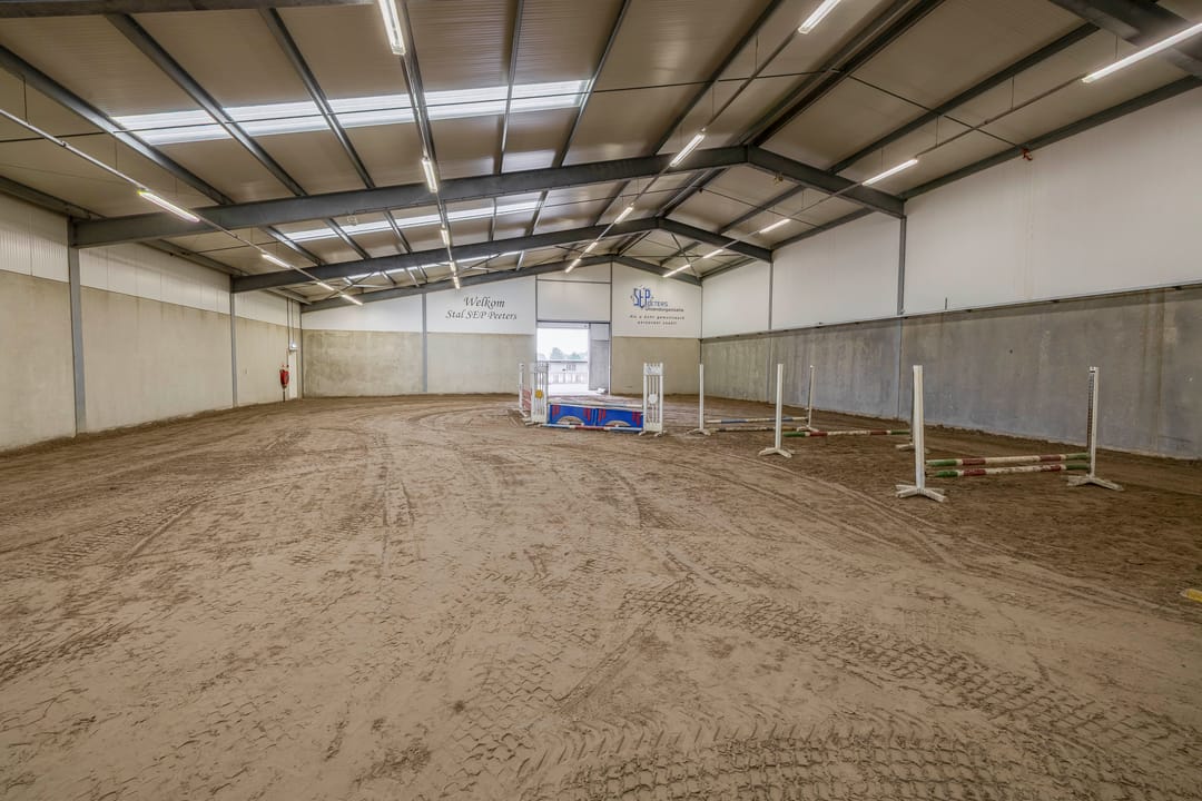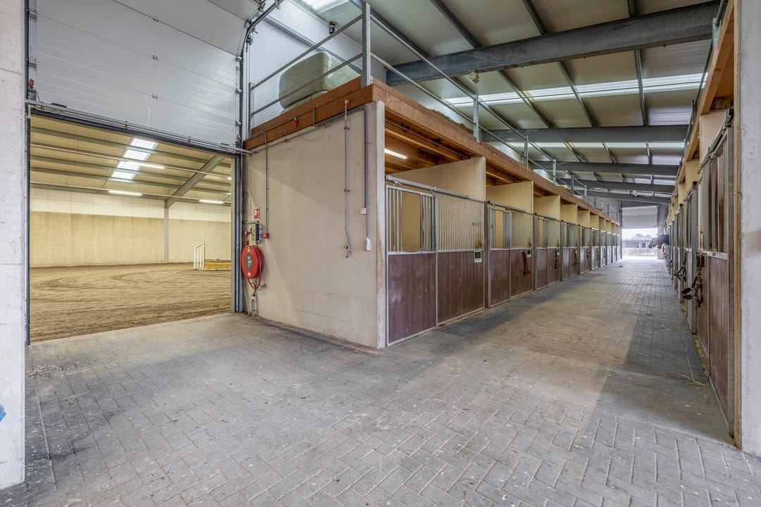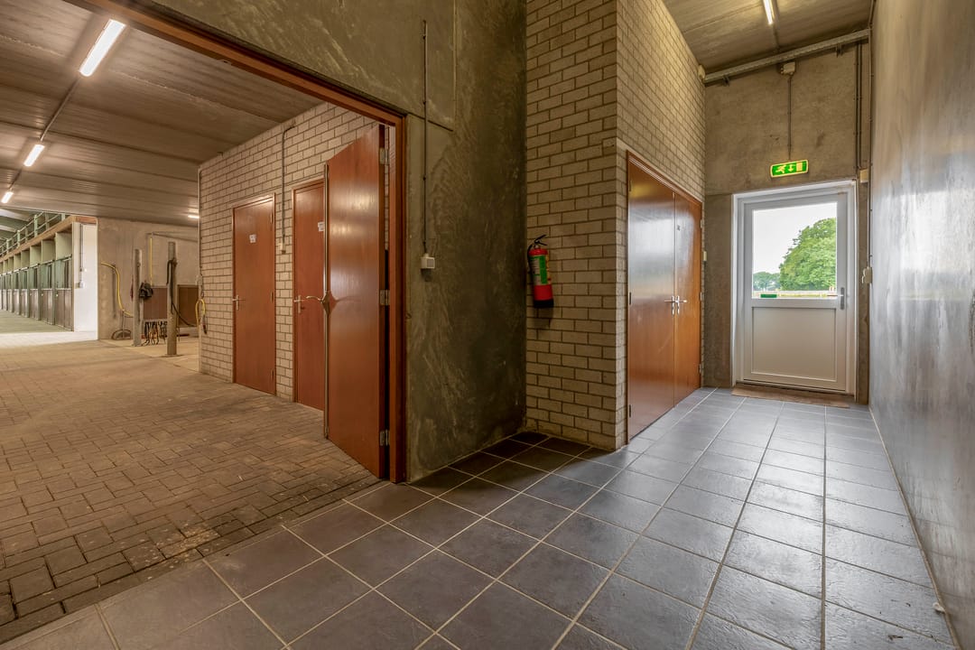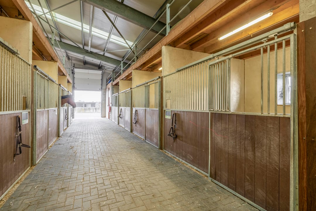 Middels een loopdeur is er toegang tot de stal. Een roldeur zorgt dan weer voor toegang tot de binnenpiste. Er zijn praktische magazijnopstellingen opstellingen gesitueerd. Er is krachtstroom aanwezig en een hogedrukleiding voor het reinigen van de stallen. Een elektrische roldeur en een loopdeur zorgen voor toegang tot het erf. Openslaande deuren zorgen voor toegang tot de rijhal. Daarnaast zijn 10 boxen uitgerust met praktische buitenluiken. Een groot voordeel is de hooizolder met handige hooiluiken, strategisch boven de stallen geplaatst, waardoor hooi en stro eenvoudig direct in de boxen kunnen worden gegooid. Verder draagt de aanwezige sleepketting voor de mest bij aan extra gemak en efficiëntie in het onderhoud van de stallen. Naast de stallen is een douche- en toiletruimte voor heren en dames gesitueerd. Ook zijn er 3 wasplaatsen aanwezig, welke zijn voorzien van een warm- en koud watervoorziening. Via een separate ingang, gelegen naast de zadelkamer is het appartement bereikbaar. Het appartement is afgewerkt met een vinylvloer, deels metselw