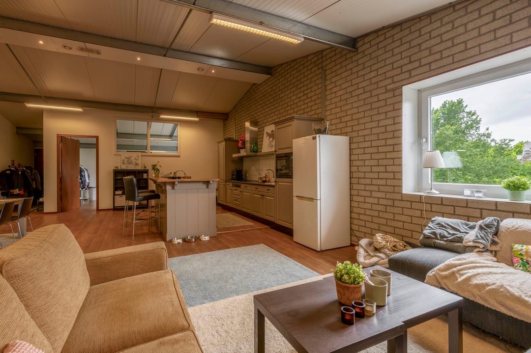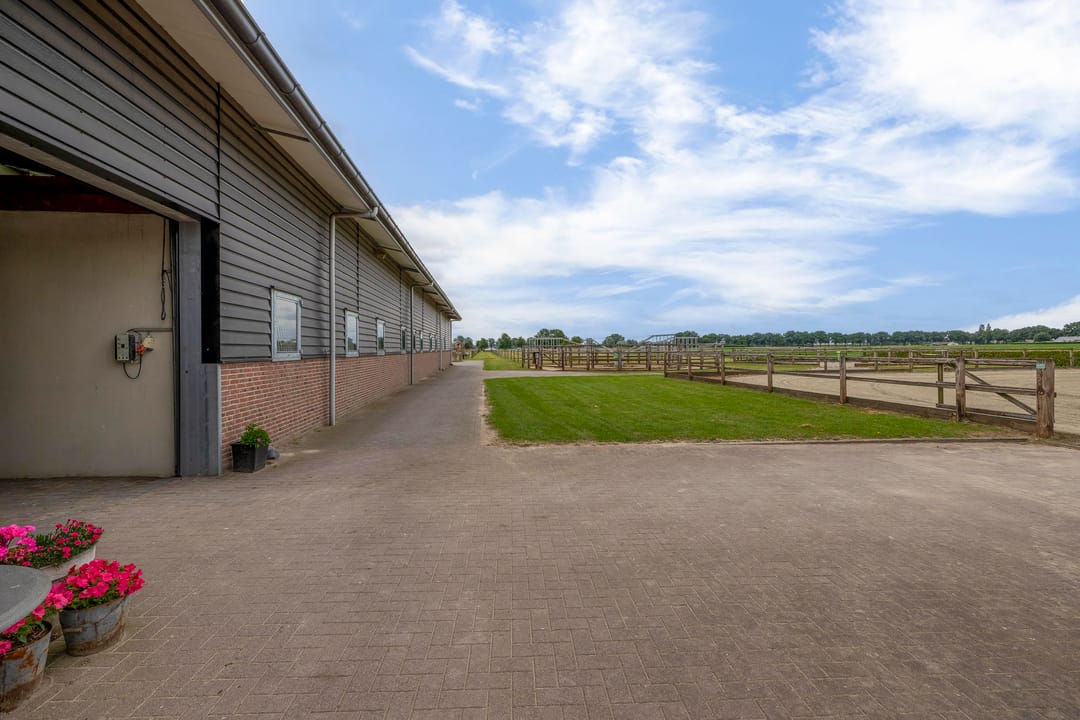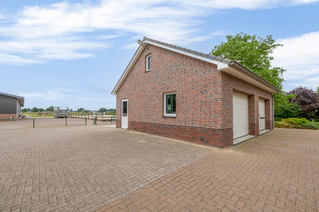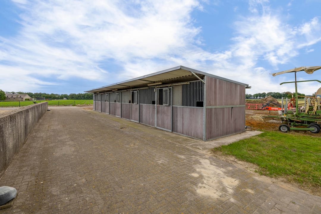 De goed onderhouden hippische accommodatie bestaat uit een vrijstaande rijhal met een binnenpiste (ca. 20x40 mtr.), een stalgedeelte met in totaal 20 paardenboxen, een ontvangstruimte met appartement, een 2e appartement en een loods/werkplaats.. Het erf is verder ingericht met een buitenpiste, 6 buitenstallen, een stapmolen, een longeercirkel, weiland, een mestvaalt. De rijhal is opgetrokken uit metselwerk gevels, stalen spanten en een geïsoleerd dak. De gevels zijn aan de buitenzijde deels gepotdekseld. Lichtdoorlatende platen zorgen voor natuurlijke lichtinval. Aan de binnenzijde zijn de gevels voorzien van betonelementen. De binnenpiste heeft een afmeting van ca. 20mtr. x 40mtr. en is uitgerust met een eb-vloed bodem. Er is een heather aanwezig. De piste is voorzien van verlichting. De wanden zijn van beton. Een roldeur in de achtergevel en een loopdeur in de zijgevel zorgen voor toegang. Het stalgedeelte is uitgerust met maar liefst 20 paardenboxen, waarvan de voorwanden deels zijn uitgevoerd in kunststof en deels in gegalvaniseerd staal. De boxen hebben betonnen tussen- en achterwanden en zijn voorzien van schuifdeuren. Aan de voorzijde van de hal is de loods/werkplaats gelegen welke is voorzien van een betonnen vloer en wanden en een betonplaten plafond. Aan de rechterzijde is de vaste trap gesitueerd naar de ontvangstruimte en het appartement op de 1e verdieping. De ruime ontvangstruimte is voorzien van een PVC-vloer en deels metselwerk/ deels stucwerk gevels. Er is een keukenblok gesitueerd welke is uitgerust met een gootsteen en een koelkast en bergruimte. De slaapkamer beschikt over dezelfde afwerking als de ontvangstruimte. De badkamer is uitgerust met een douche en een wastafel. Ook is er een zwevend toilet aanwezig. Vanuit de ontvangstruimte is er een fraai zicht op de binnenpiste. In de berging zijn de aansluitingen voor de wasapparatuur, de unit voor de vloerverwarming, de opstelling voor de CV-ketel (Nefit Topline) en de omvormer voor de zonnepanelen gesitueerd. De stro opslag aan de achterzijde van de rijhal is afgewerkt met een betonnen vloer. De voersilo is hier gesitueerd. Een roldeur aan de achtergevel en een loopdeur zorgen voor toegang tot het erf. Het dak is geïsoleerd.