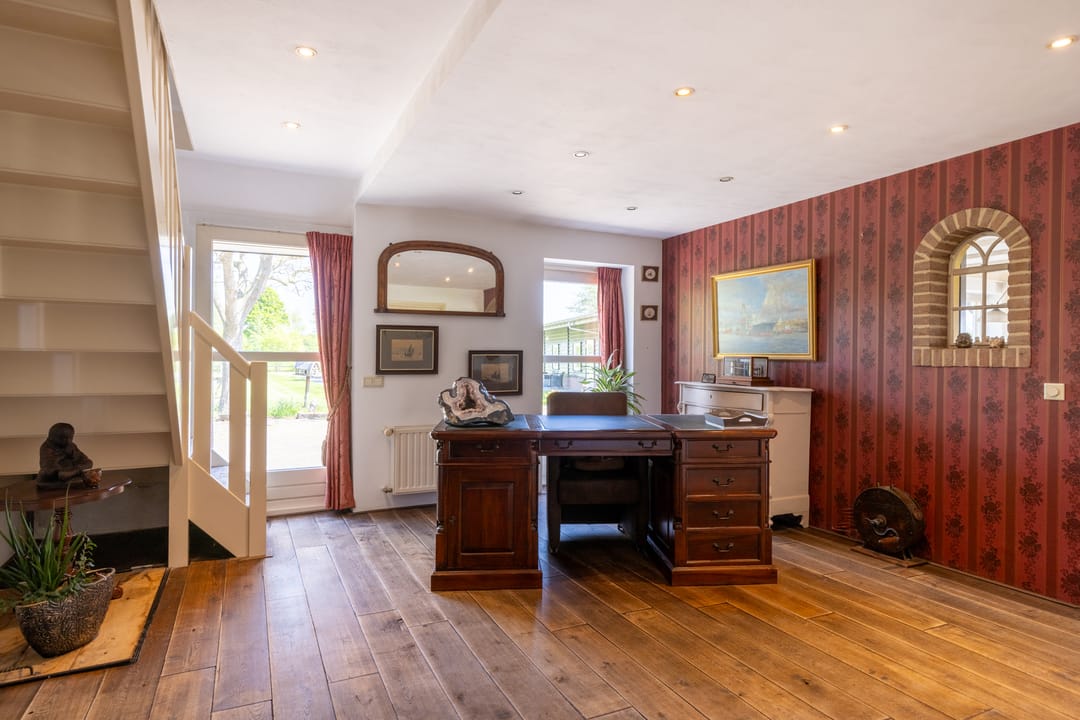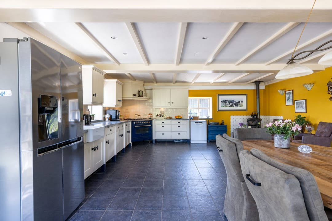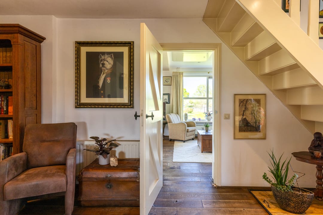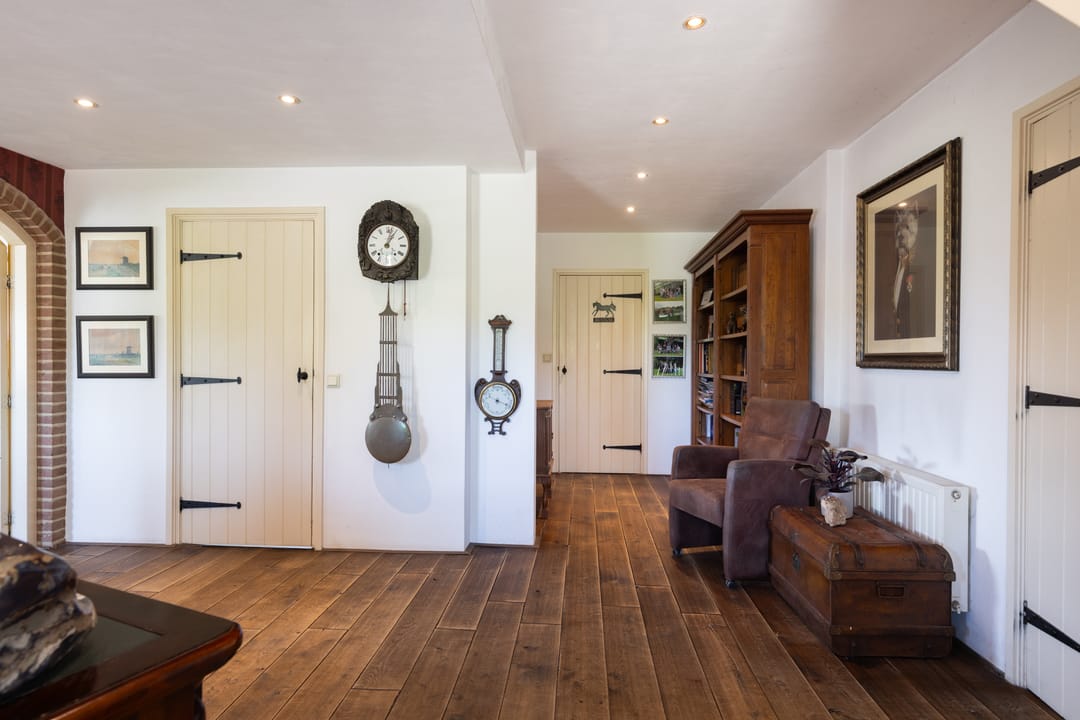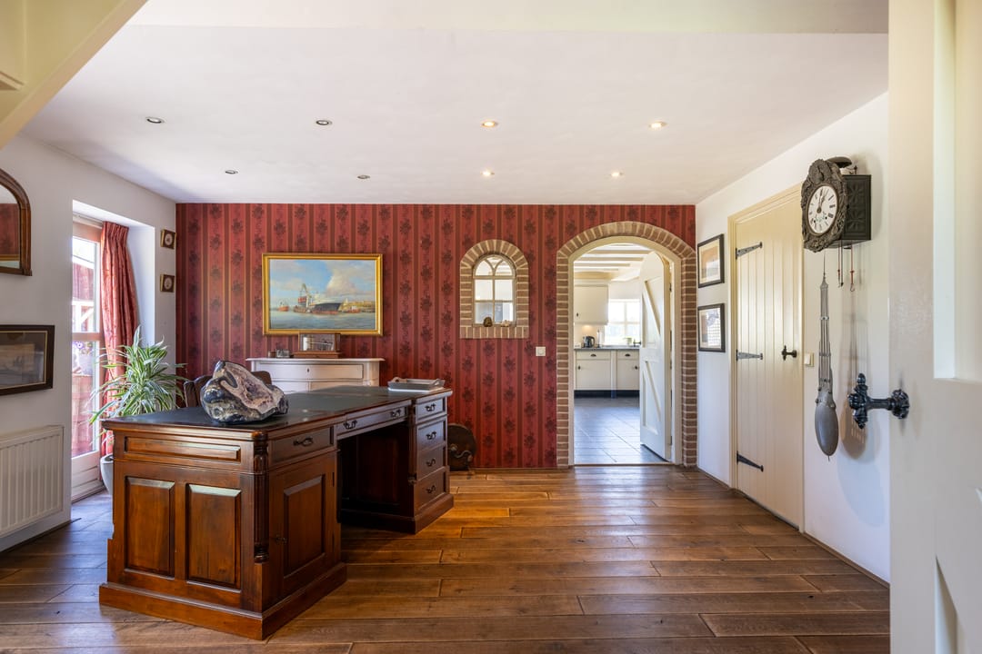 Via de entree betreedt u een ruime hal met toegang tot een royaal separaat toilet en de praktische wasruimte. In deze ruimte vindt u tevens inbouwkasten welke een praktische oplossing bieden voor opbergruimte. De hal is momenteel multifunctioneel ingericht en doet mede dienst als een kantoorruimte. Via deze ruime opgezette hal loopt u verder naar de sfeervolle woonkamer met veel daglicht en een landelijke uitstraling. Aan de andere zijde van de hal treft u de aangrenzende woonkeuken. Deze woonkeuken vormt het hart van het huis: een bijzonder royale ruimte van circa 60 m² met prachtig zicht op het omliggende landschap, een landelijke keukenopstelling en plaats voor een grote eettafel. Een ideale ruimte voor een lange zit met een goed gezelschap.