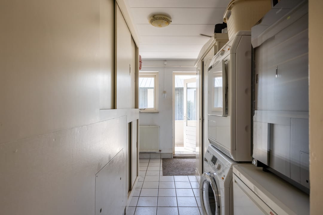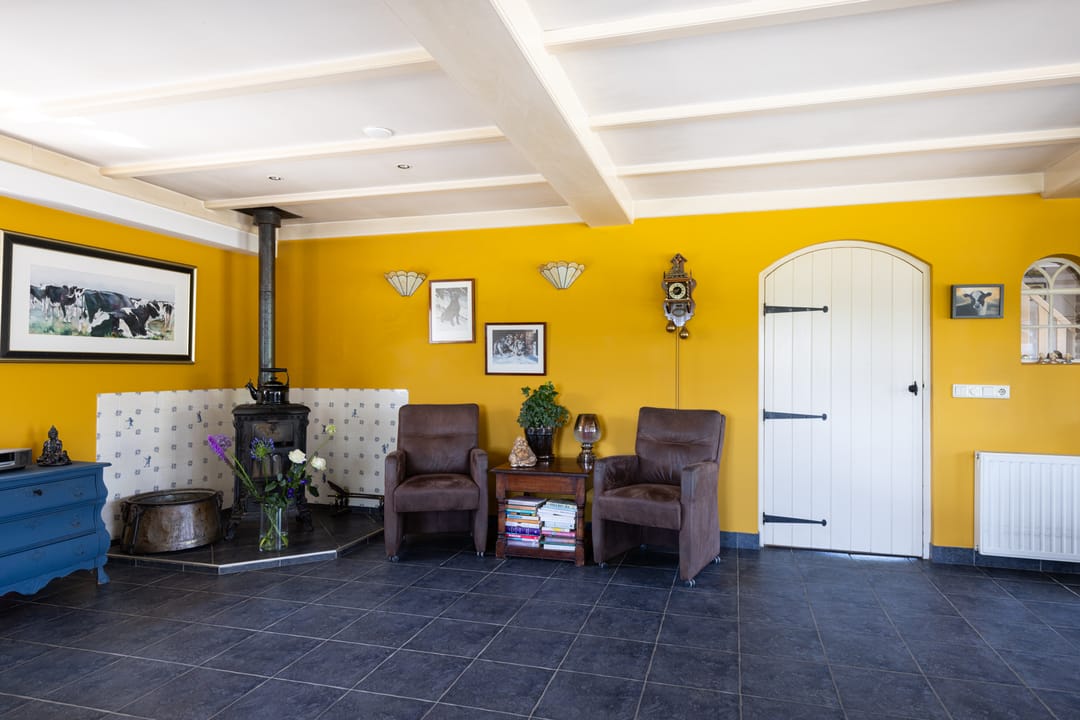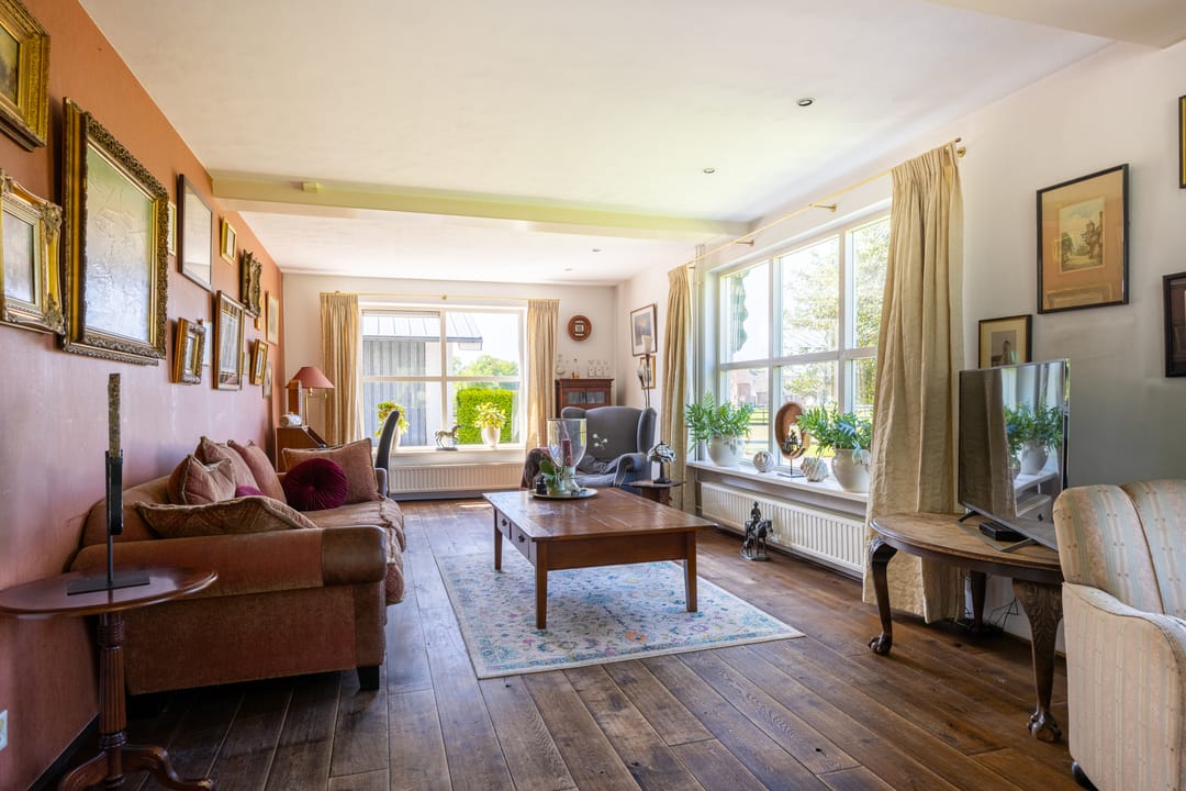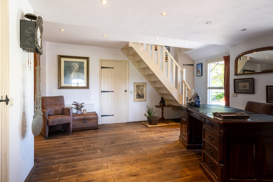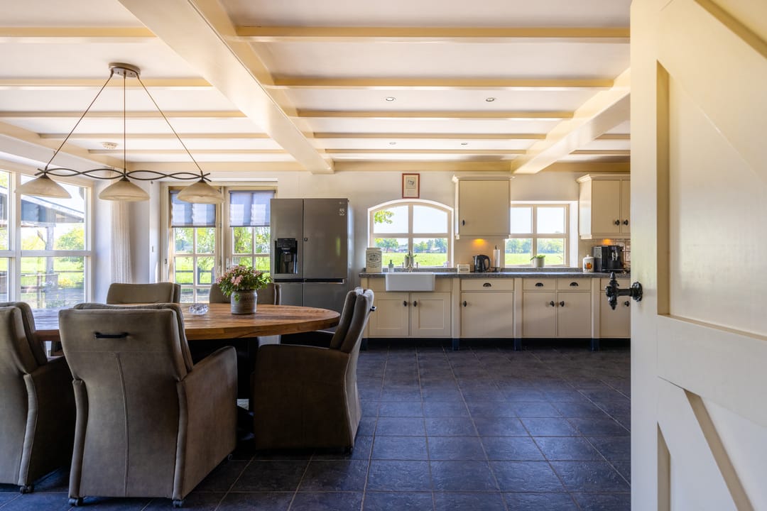 Via de entree betreedt u een ruime hal met toegang tot een royaal separaat toilet en de praktische wasruimte. In deze ruimte vindt u tevens inbouwkasten welke een praktische oplossing bieden voor opbergruimte. De hal is momenteel multifunctioneel ingericht en doet mede dienst als een kantoorruimte. Via deze ruime opgezette hal loopt u verder naar de sfeervolle woonkamer met veel daglicht en een landelijke uitstraling. Aan de andere zijde van de hal treft u de aangrenzende woonkeuken. Deze woonkeuken vormt het hart van het huis: een bijzonder royale ruimte van circa 60 m² met prachtig zicht op het omliggende landschap, een landelijke keukenopstelling en plaats voor een grote eettafel. Een ideale ruimte voor een lange zit met een goed gezelschap.