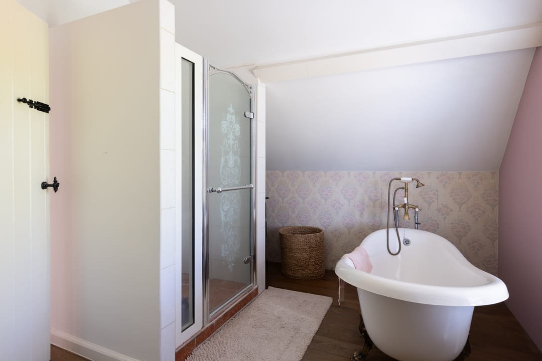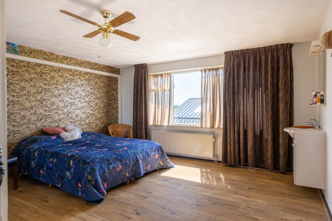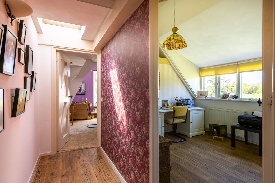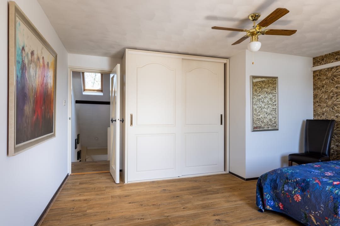 De overloop biedt toegang tot een apart toilet, aansluitend een ruime badkamer met ligbad, separate douche en wastafel, en vier comfortabele slaapkamers. Drie van de kamers zijn voorzien van praktische inbouwkasten, wat zorgt voor extra bergruimte en comfort.