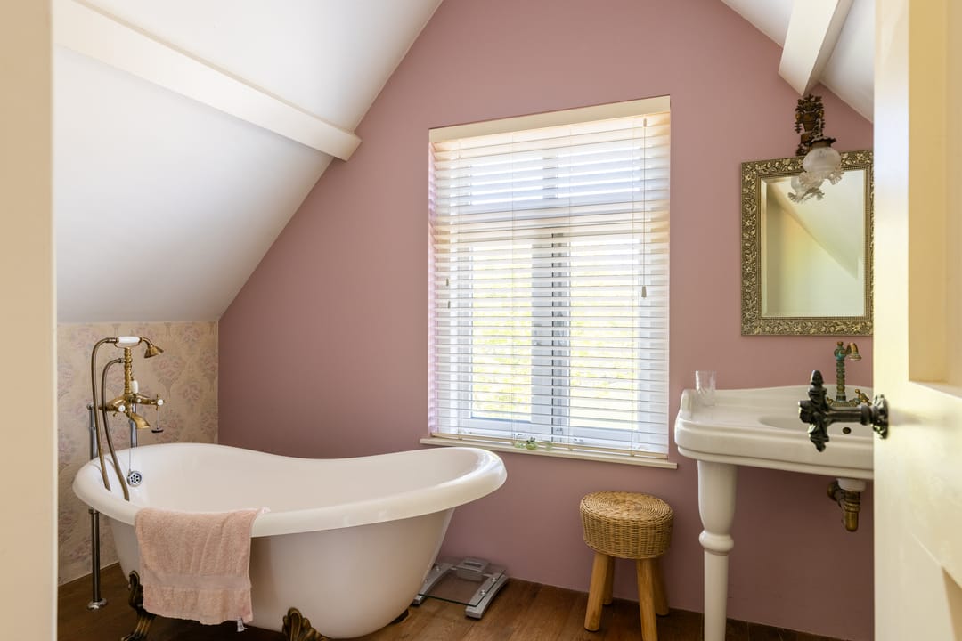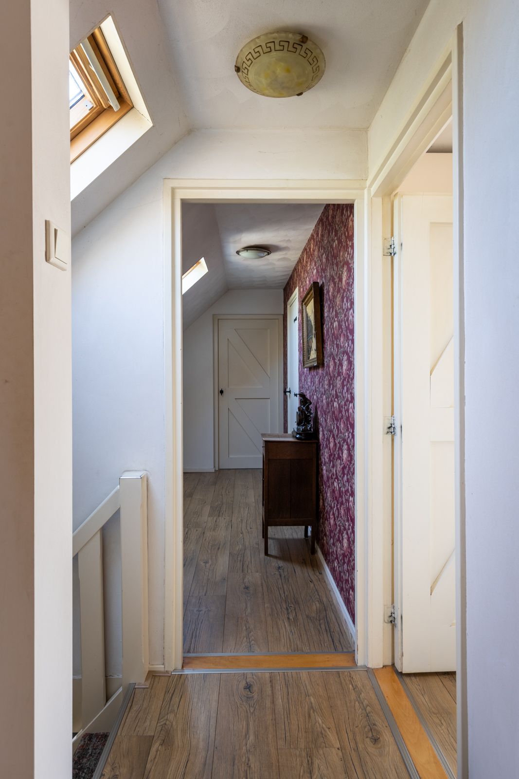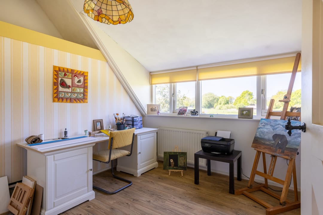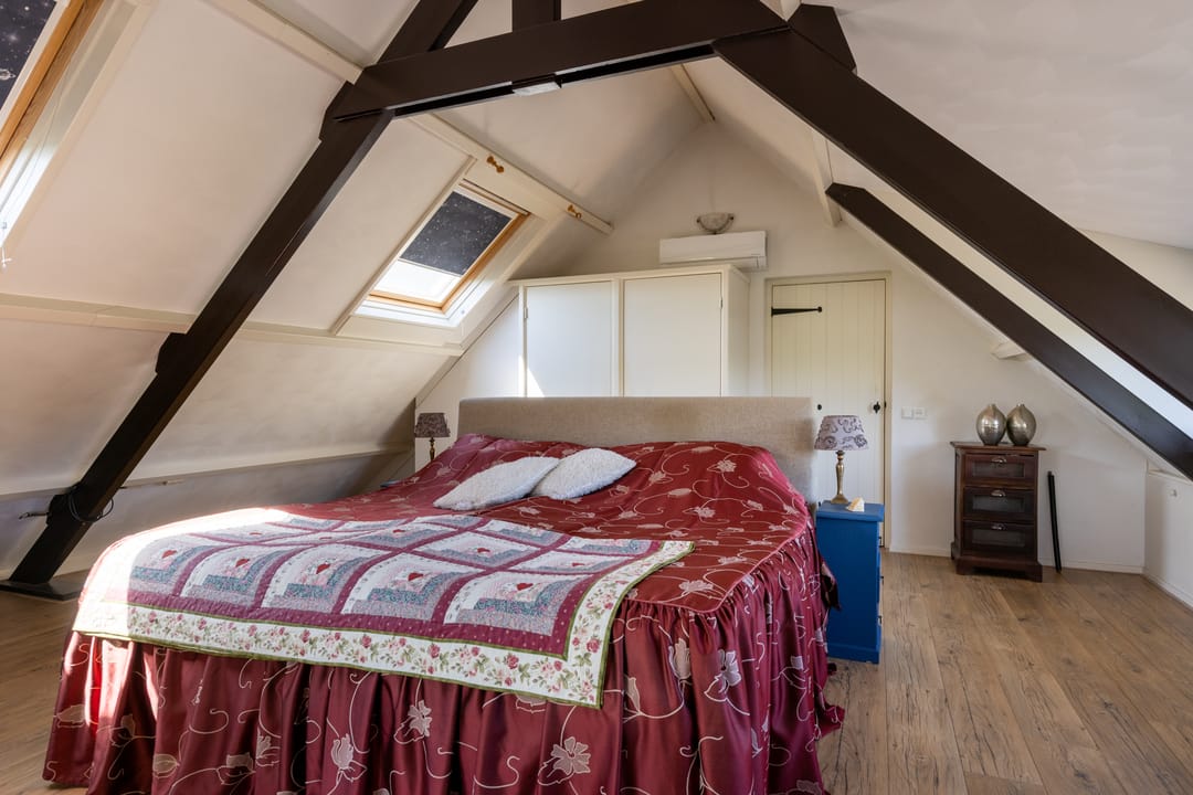 De overloop biedt toegang tot een apart toilet, aansluitend een ruime badkamer met ligbad, separate douche en wastafel, en vier comfortabele slaapkamers. Drie van de kamers zijn voorzien van praktische inbouwkasten, wat zorgt voor extra bergruimte en comfort.