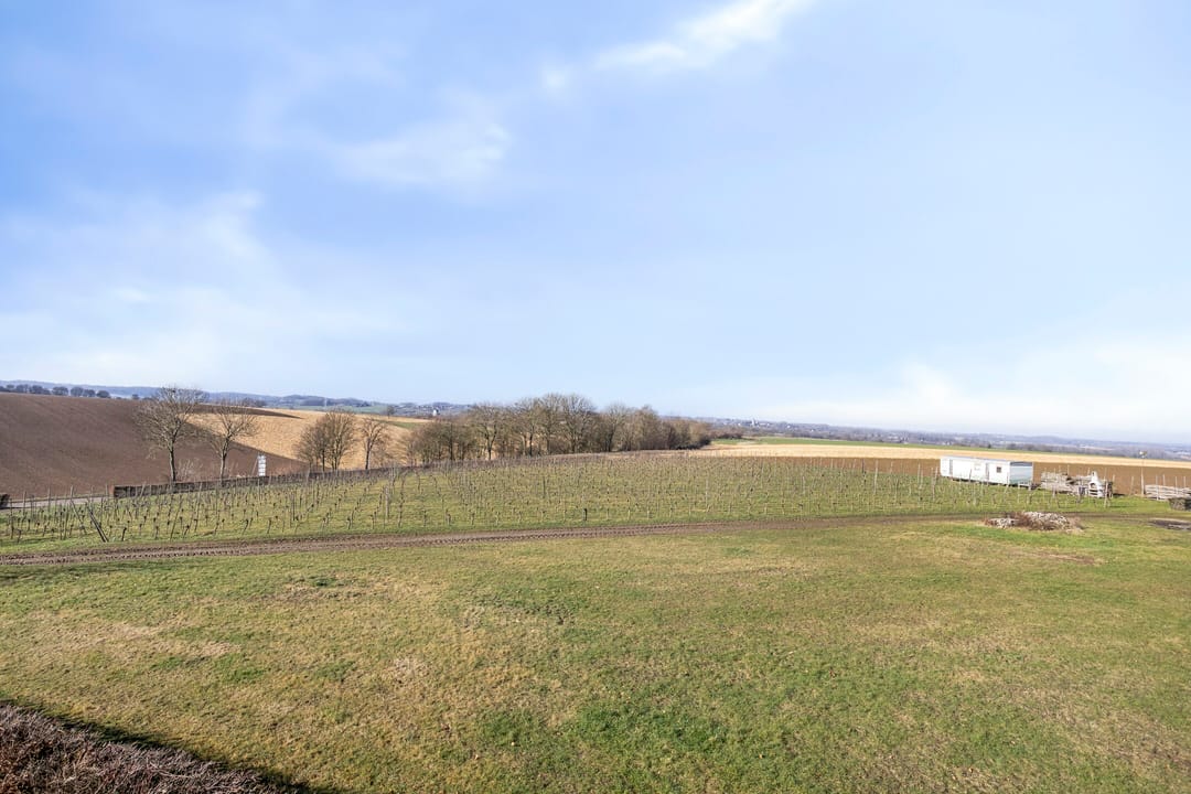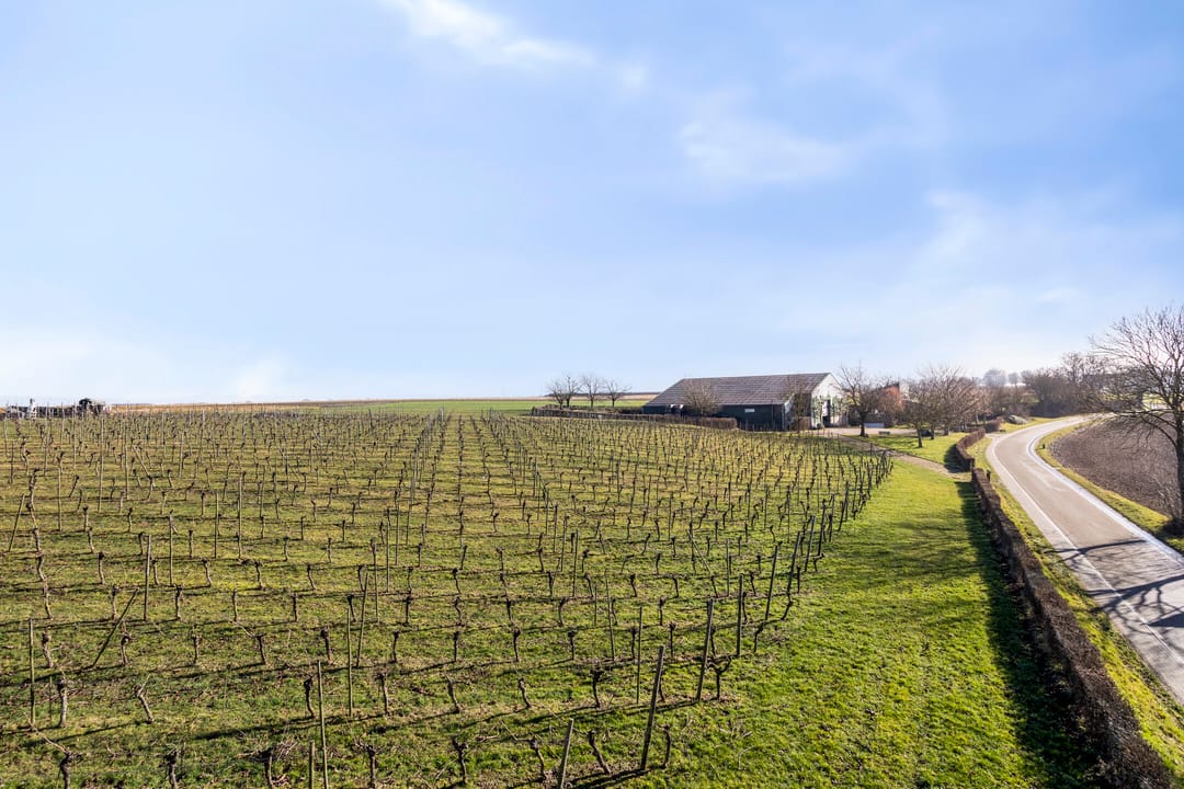 De wijngaard van ca. 0,5 ha ligt fraai op het glooiende perceel en sluit mooi aan bij het open heuvellandschap rondom de locatie. De aanplant bestaat uit drie sterke en veelgebruikte rassen, namelijk de Johanniter en Solaris (wit) en Cabernet Cortis (rood). De rijen zijn overzichtelijk aangelegd en profiteren van