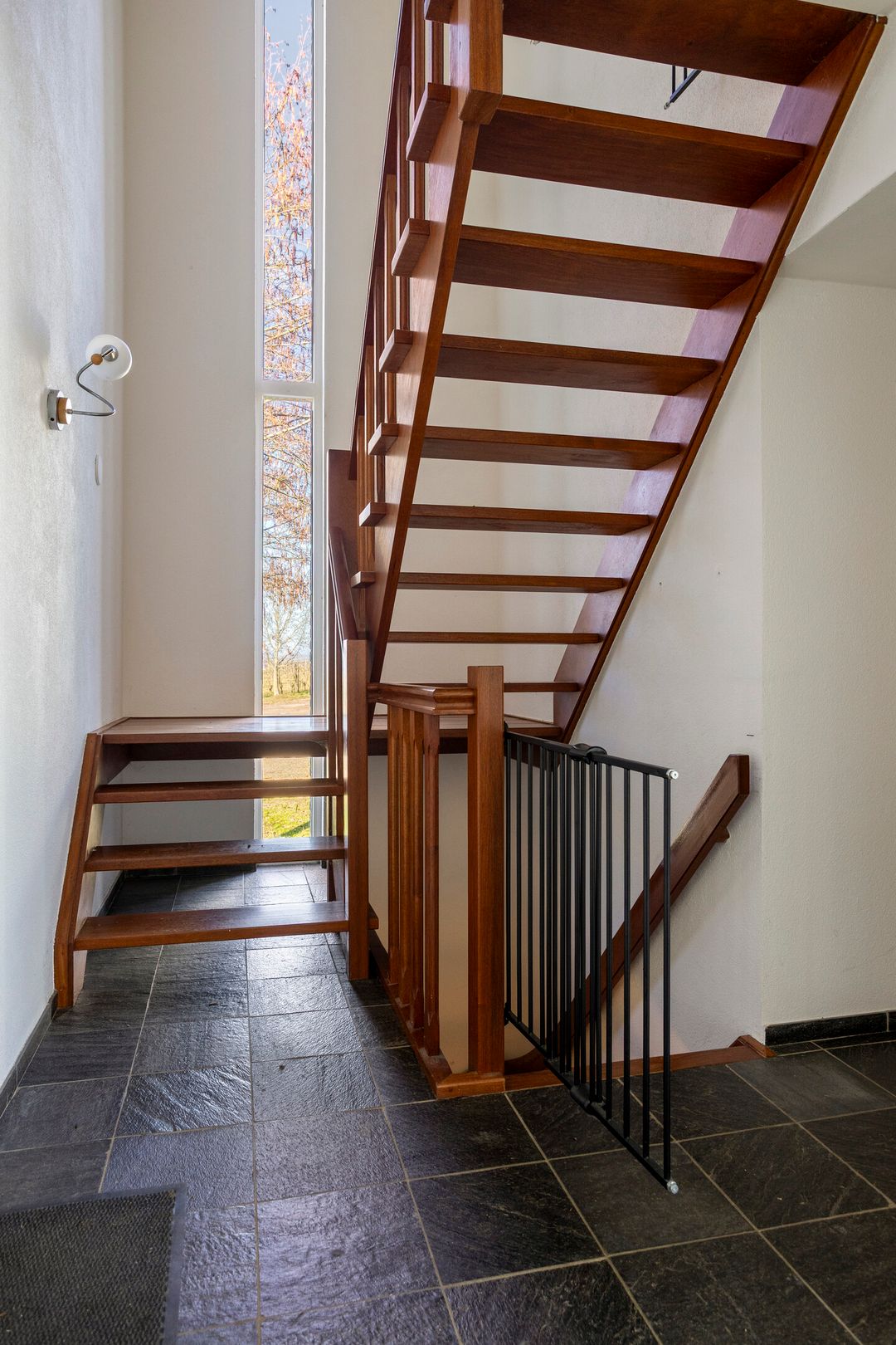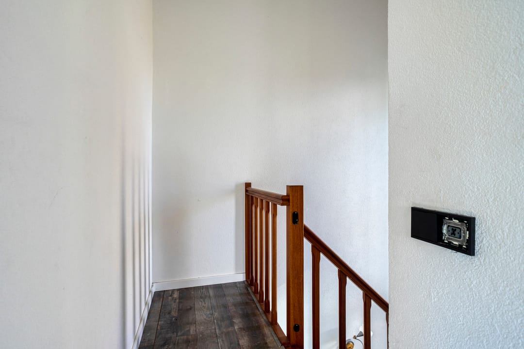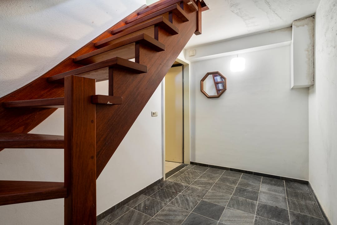 Via de voordeur aan de voorzijde van de woning betreedt u een imposante hal, waar tevens het trappenhuis is gesitueerd dat toegang biedt tot zowel de bovenverdieping als de kelder en de inpandige garage. In deze hal bevindt zich daarnaast een separaat toilet en de meterkast. Via dubbele glazen deuren bereikt u de naastgelegen woonkamer. De hal is afgewerkt met een leistenen tegelvloer en strak gestucte wanden, wat direct een verzorgde en uitnodigende indruk geeft.
