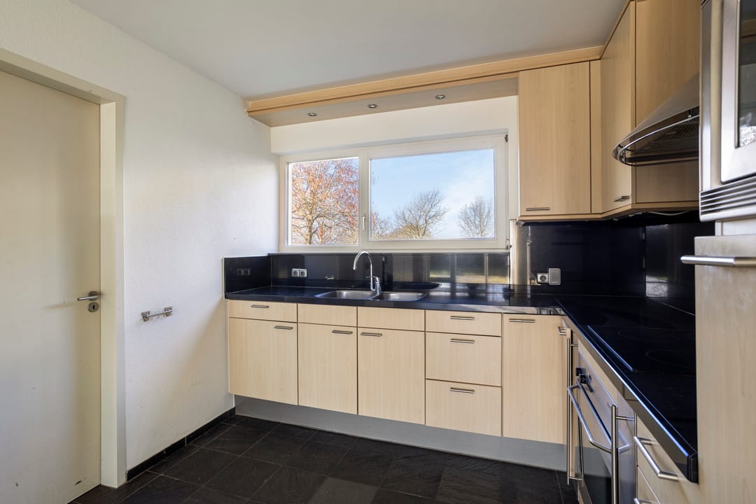 De open woonkeuken is opgesteld in een praktische L-vorm en beschikt aan de linkerzijde over een losse kastenopstelling. De keuken is uitgevoerd in hout en voorzien van een hardstenen werkblad, wat zorgt voor een warme en robuuste uitstraling. De keuken is uitgerust met de benodigde inbouwapparatuur, waaronder een ingebouwde koelkast, oven, inductiekookplaat met afzuigkap en een dubbele spoelbak. De raampartij boven de spoelbak zorgt voor veel natuurlijk licht en een prettig uitzicht over het eigen terrein en de wijngaard. De leistenen vloer en strak gestucte wanden van de woonkamer lopen door in de keuken, waardoor er een rustig geheel ontstaat. Via de keuken is tevens een (was)ruimte bereikbaar, waar de benodigde witgoedaansluitingen aanwezig zijn. De vloer bestaat uit dezelfde leistenen vloer en wanden die voor driekwart betegeld zijn.