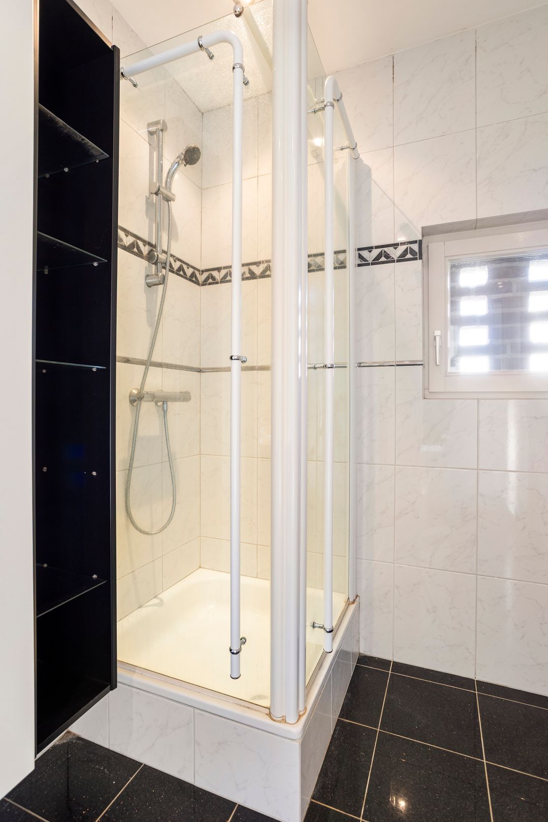 De badkamer is ruim van opzet en uitgevoerd met een tegelvloer en volledig betegelde wanden. De ruimte wordt verwarmd middels vloerverwarming en is ingericht met een inloopdouche, ligbad, vaste wastafel en een zwevend toilet.