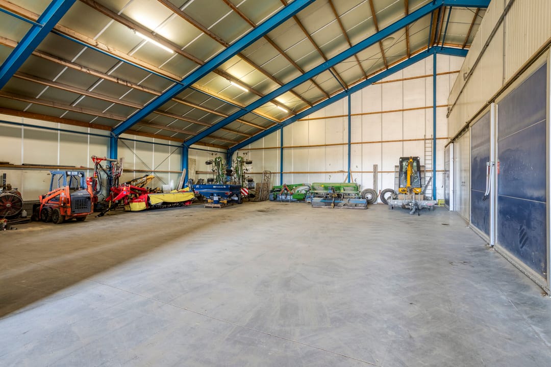De bedrijfsloods (bj. 1997) heeft een oppervlakte van ca. 750 m² (ca. 25 m x 30 m vrije overspanning) en is degelijk gebouwd. De loods is voorzien van een gevlinderde betonvloer en beschikt over een kantine met eenvoudig keukenblok, toilet, douche en een separate meterkast met een 3x35A aansluiting. Daarnaast is er een interne doorgang naar de woning, waar zich tevens een praktische werkplaats bevindt. De loods is voorzien van gevel- en dakisolatie (Dupanel). De buitengevel bestaat uit damwandprofielplaten en het dak is bedekt met golfplaten.