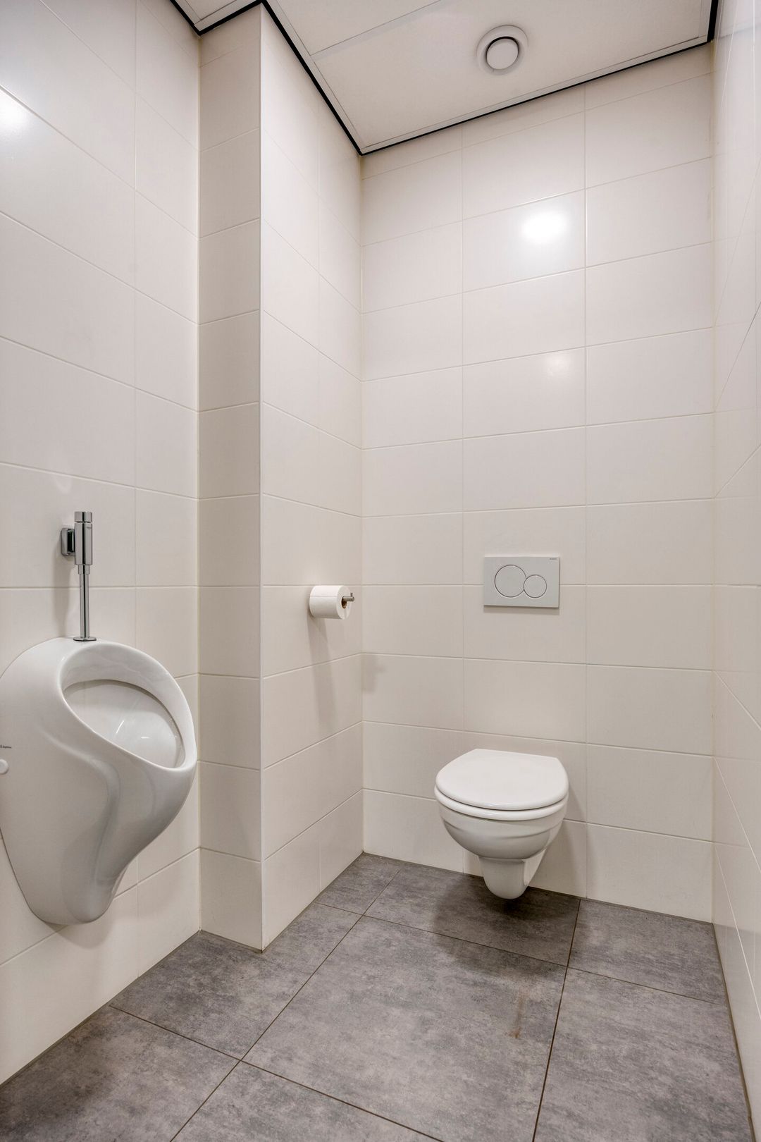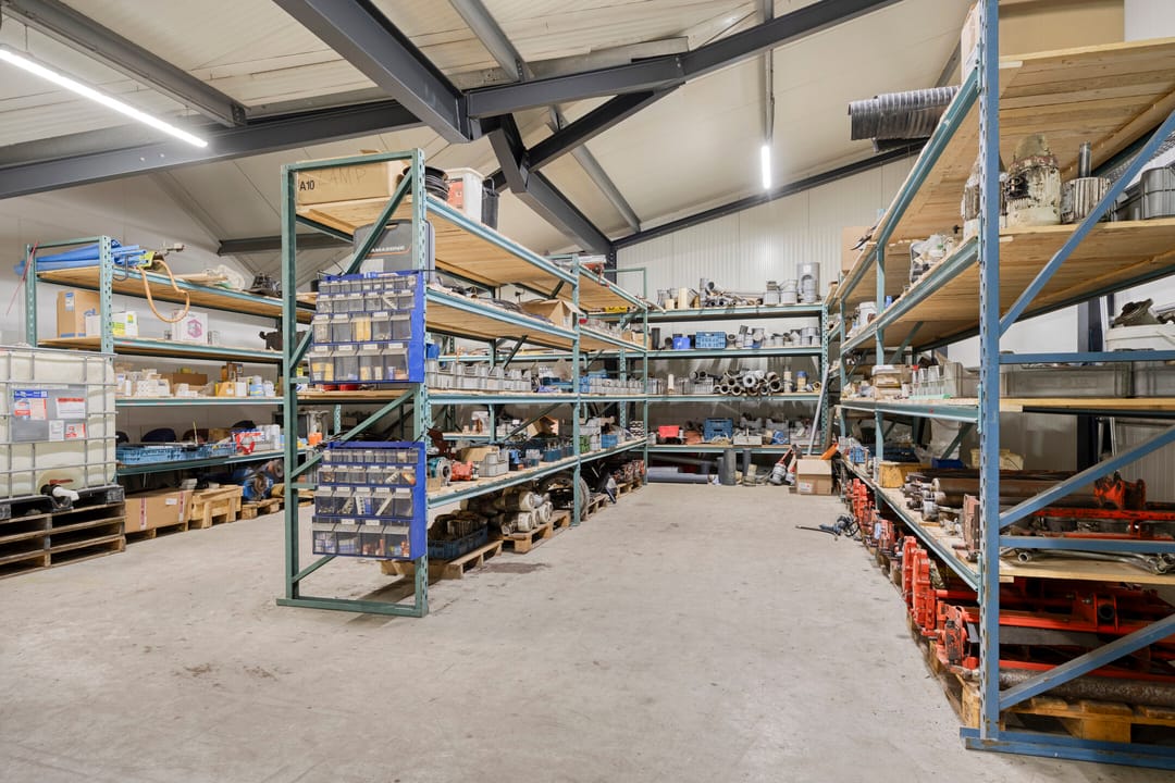 Indeling begane grond: Stijlvolle kantoorruimte met balie en airco (ca. 10 x 6 m). Twee toiletruimten. Tussengang met meterkast (3 x 250 Amp). Voorruimte met garage voorzien van drie elektrische overheaddeuren (3 x 3 m). Werkplaats met vloerverwarming en vaste trap naar het magazijn op de verdieping. Koelcel, circa 100 m². Technische ruimte.