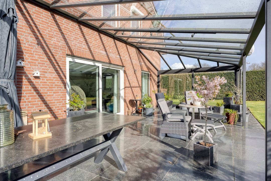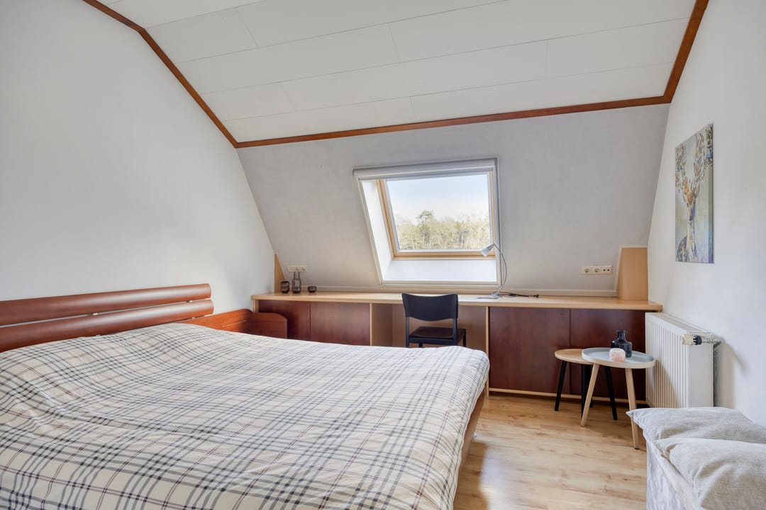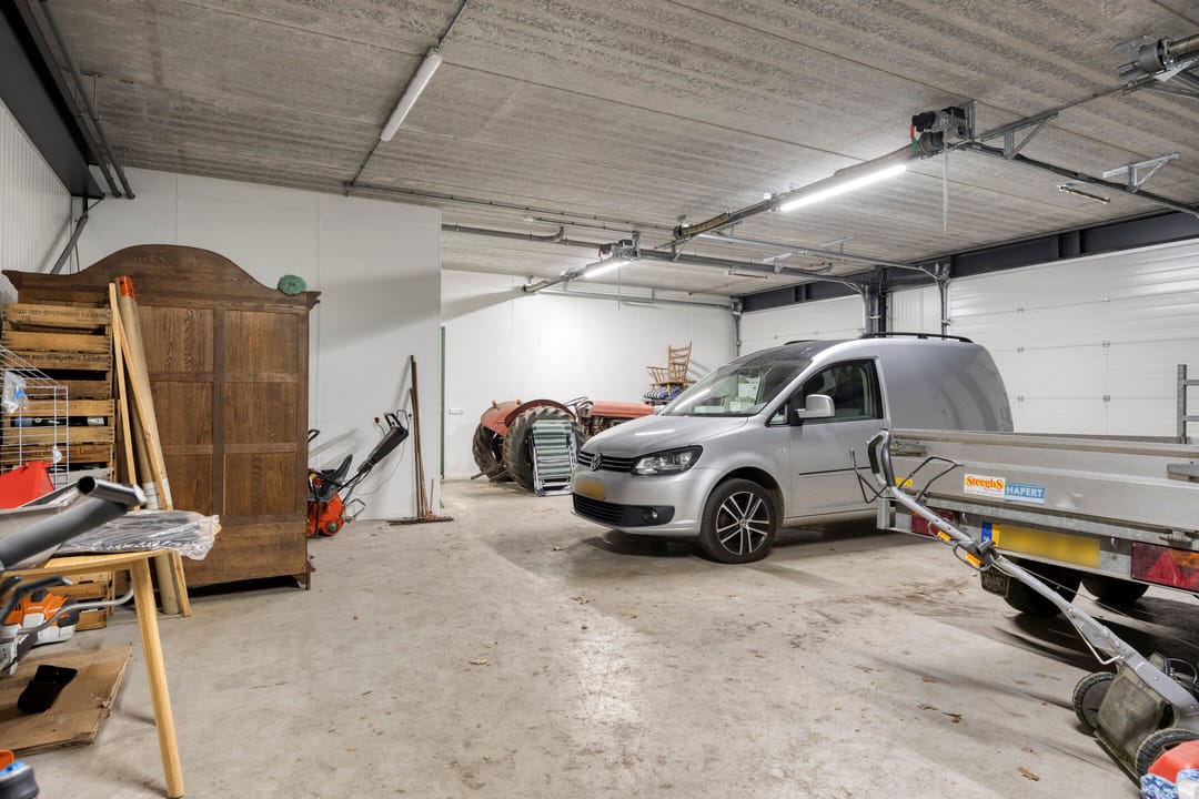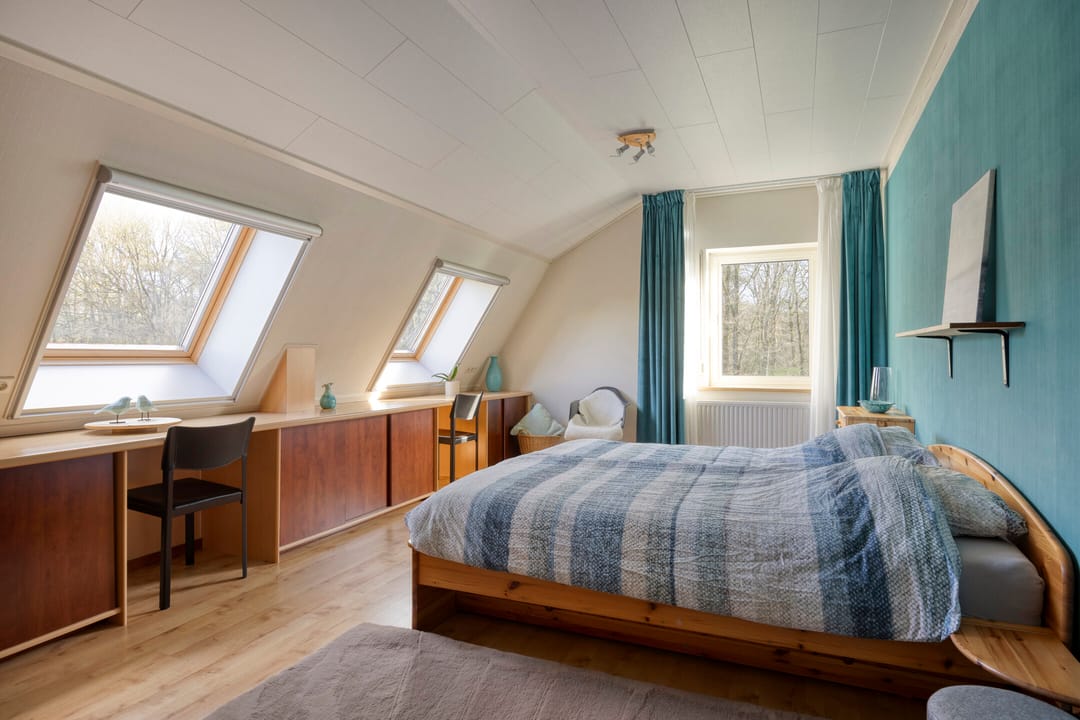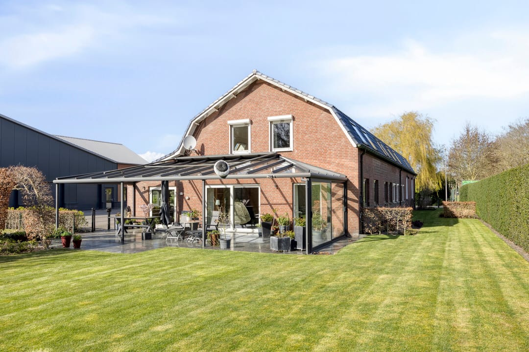 Verdieping: Via de trappenhal met plateau bereik je de verdieping. De ruime overloop biedt toegang tot maar liefst vijf slaapkamers, een toiletruimte met closet en urinoir, een fitnessruimte met technische ruimte en kastruimte, én een luxe, volledig betegelde badkamer (ca. 2004) met douchecabine, jacuzzi, badmeubel met dubbele wastafel, designradiator en mechanische ventilatie. De slaapkamers beschikken over praktische bergruimte, gecreëerd middels schuifkasten in de knieschotten. De grote Velux-dakramen met zonwering en horren zorgen voor een natuurlijke lichtinval. De kamers zijn afgewerkt met laminaatvloeren en behangwanden. Een zesde zeer ruime (slaap)kamer is ingericht als fitnessruimte en biedt eveneens praktische bergruimte in de knieschotten. Hier vind je de technische ruimte met warmwatervoorraad (ca. 1.000 liter) en verdelers. De woning beschikt bovendien over een bergzolder over bijna de volle lengte van de langgevelboerderij. De verzorgd aangelegde tuin beschikt over een fraai betegeld terras met sfeervolle serre/overkapping, een strak gazon, hagen en gevarieerde beplanting. Een getoogde berkenlaan met beklinkerd pad leidt naar een achtergelegen schaduwrijk terras. De tuin beschikt over ondergrondse beregeningsleidingen met sproeipunten. De woning met tuin grenst direct aan het ruime erf met bedrijventerrein.