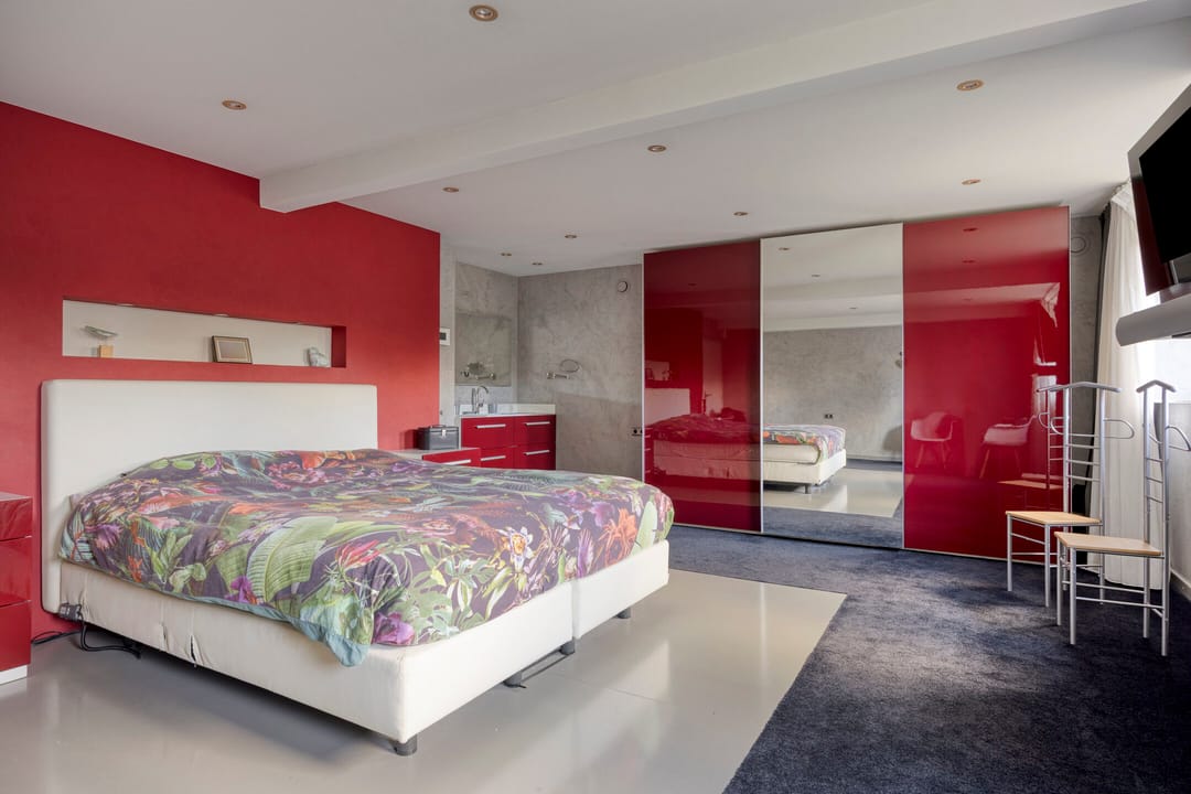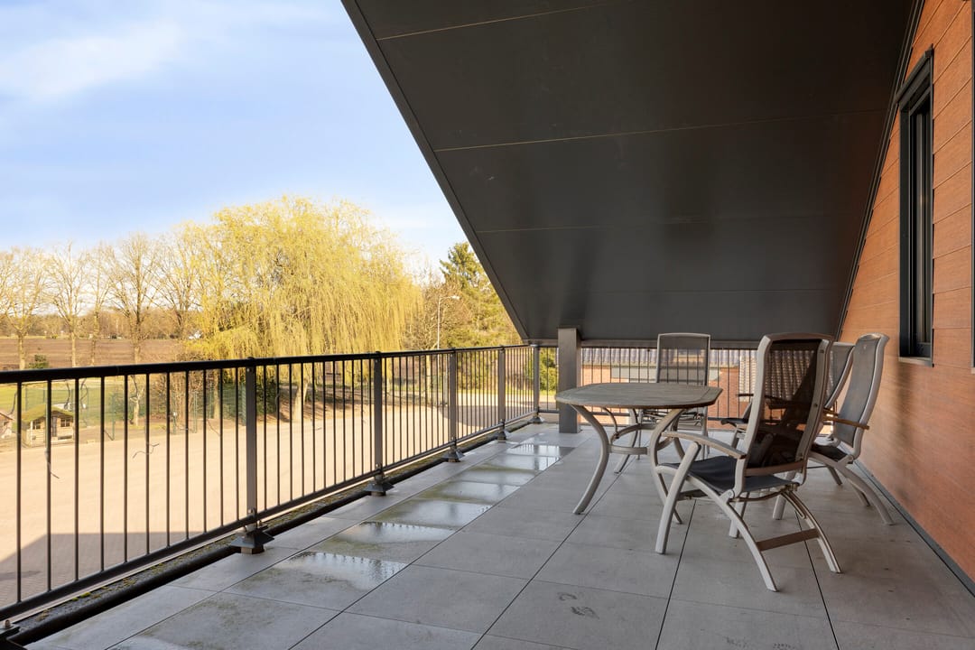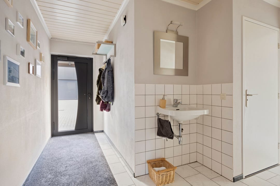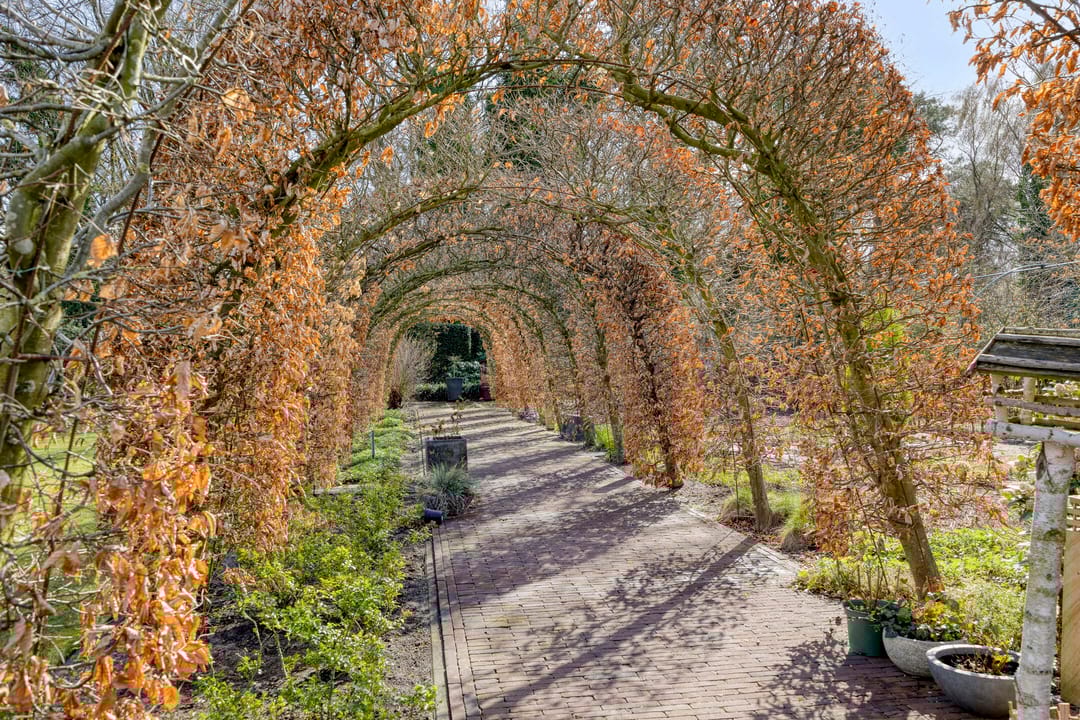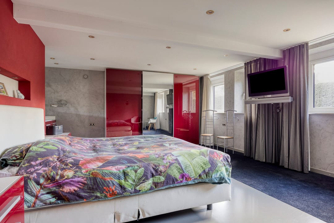 Verdieping: Via de trappenhal met plateau bereik je de verdieping. De ruime overloop biedt toegang tot maar liefst vijf slaapkamers, een toiletruimte met closet en urinoir, een fitnessruimte met technische ruimte en kastruimte, én een luxe, volledig betegelde badkamer (ca. 2004) met douchecabine, jacuzzi, badmeubel met dubbele wastafel, designradiator en mechanische ventilatie. De slaapkamers beschikken over praktische bergruimte, gecreëerd middels schuifkasten in de knieschotten. De grote Velux-dakramen met zonwering en horren zorgen voor een natuurlijke lichtinval. De kamers zijn afgewerkt met laminaatvloeren en behangwanden. Een zesde zeer ruime (slaap)kamer is ingericht als fitnessruimte en biedt eveneens praktische bergruimte in de knieschotten. Hier vind je de technische ruimte met warmwatervoorraad (ca. 1.000 liter) en verdelers. De woning beschikt bovendien over een bergzolder over bijna de volle lengte van de langgevelboerderij. De verzorgd aangelegde tuin beschikt over een fraai betegeld terras met sfeervolle serre/overkapping, een strak gazon, hagen en gevarieerde beplanting. Een getoogde berkenlaan met beklinkerd pad leidt naar een achtergelegen schaduwrijk terras. De tuin beschikt over ondergrondse beregeningsleidingen met sproeipunten. De woning met tuin grenst direct aan het ruime erf met bedrijventerrein.