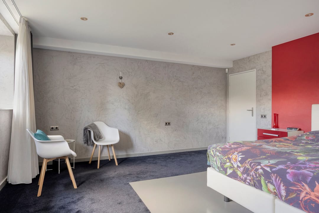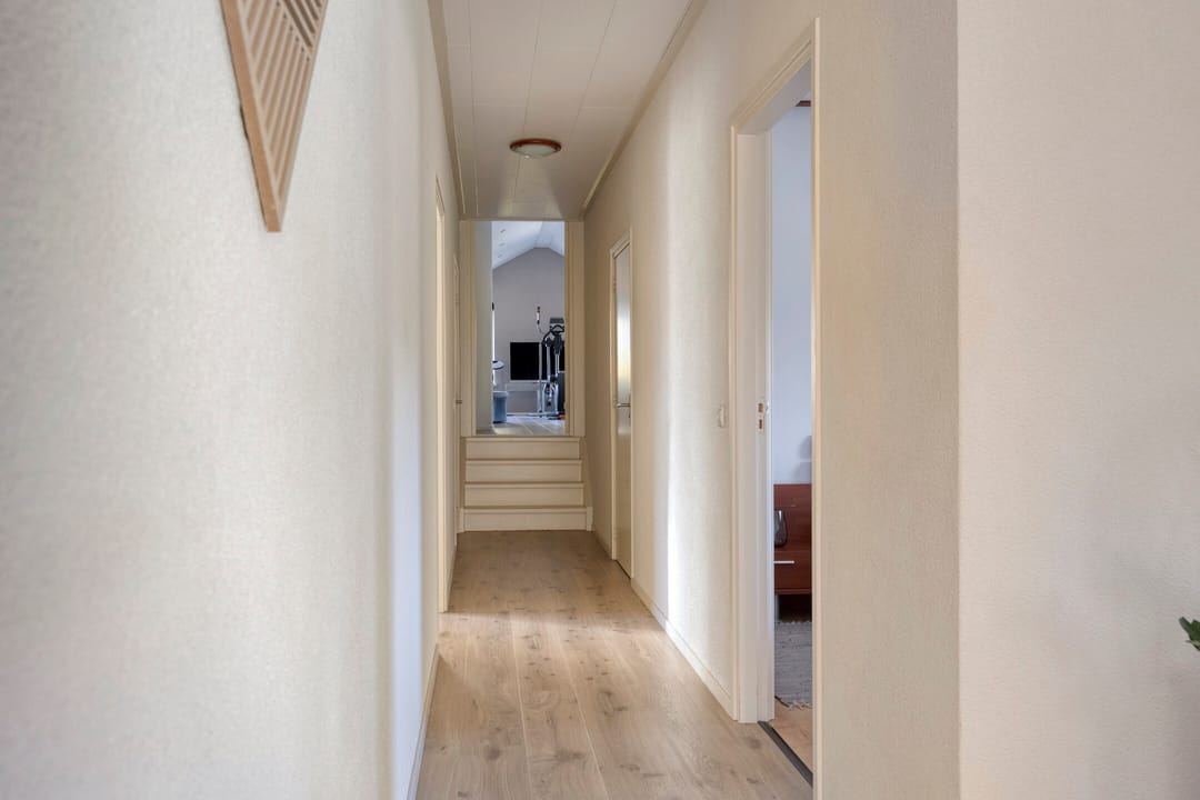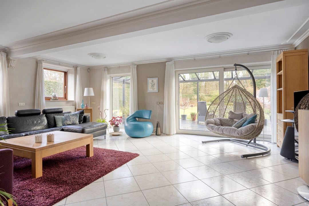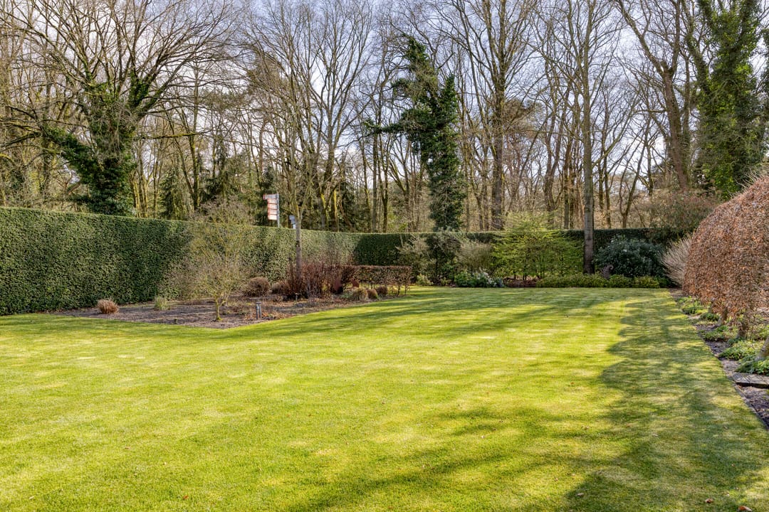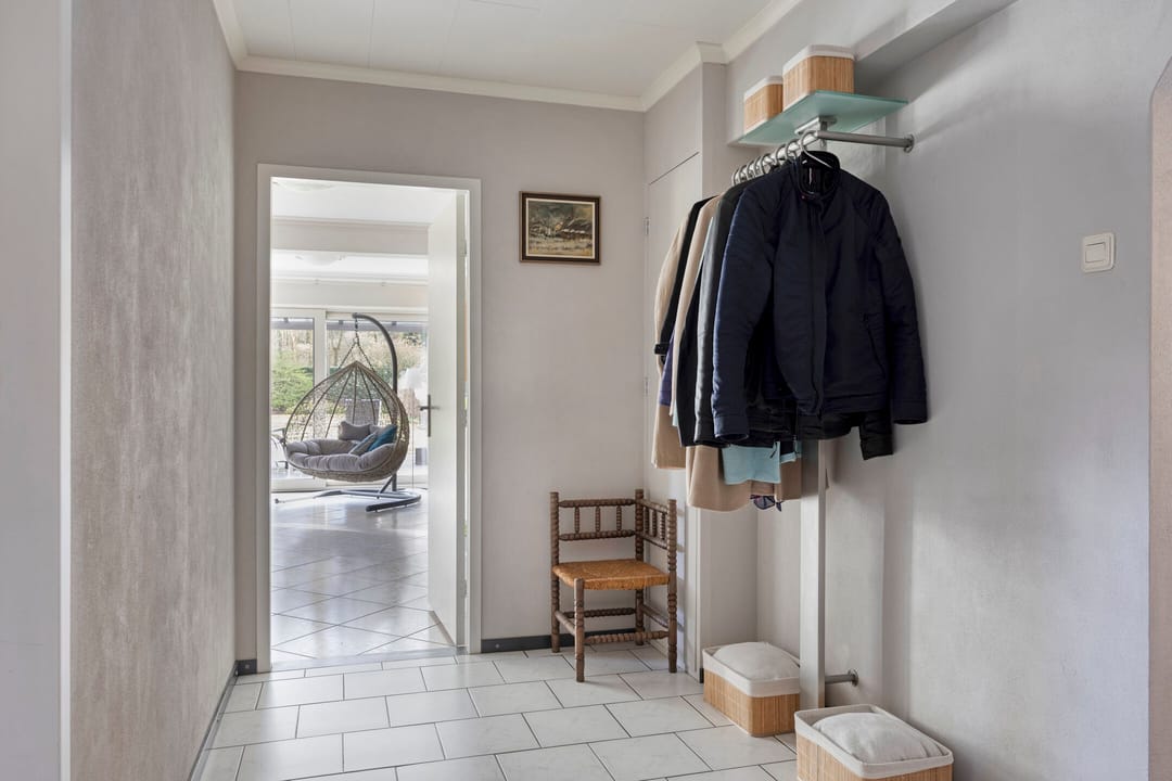 Begane grond: De stijlvolle keuken is uitgerust met kersenhouten fronten, een composiet aanrechtblad met 1,5 spoelbak en Quooker-kraan, een 5-pits inductiekookplaat met afzuigkap op het kookeiland, een koelkast en Miele-apparatuur, waaronder een stoomoven, oven en vaatwasser. Het plafond is voorzien van inbouwspots. Via de openslaande tuindeuren bereik je de lichte serre/overkapping met aluminium puien, automatische zonwering en schuifpuien. Vanuit het fraai betegelde terras geniet je van een prachtig uitzicht over de tuin en bossen. De woonkamer is ingericht met tegelvloer en gestucte wanden en plafonds, voorzien van stijlvolle sierlijsten en ornamenten. Ook hier is er directe toegang tot het terras middels een schuifpui. De centrale gang, deels voorzien van kamerhoge kastenwanden, biedt toegang tot de trappenhal naar de verdieping, de masterbedroom en de garage. Via een overkapping aan de buitenzijde bereik je de entree (met wastafel), die op haar beurt toegang biedt tot de centrale gang, de keuken, het toilet en de werkkamer. De zeer ruime masterbedroom beschikt over airconditioning en een display voor bediening van de WTW-installatie. De kamer is voorzien van een wastafelmeubel en inbouwspots in het plafond. In de garage met sectionaaldeur bevinden zich de WTW-installatie, witgoedaansluitingen en een gootsteen. Via de buitenzijde bereik je een tweede geheel betegelde toiletruimte met staand closet en urinoir. De ruime werkkamer kan ook uitstekend dienstdoen als extra slaapkamer op de begane grond en heeft een aangrenzende, volledig betegelde badkamer met douche en een separaat toilet.