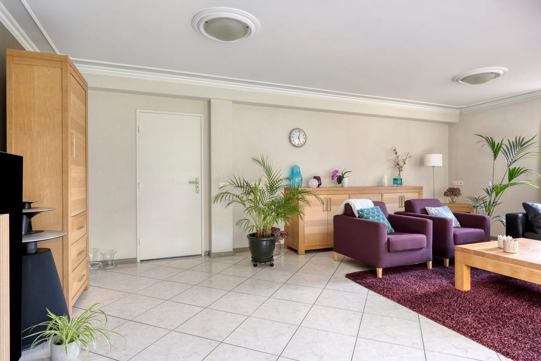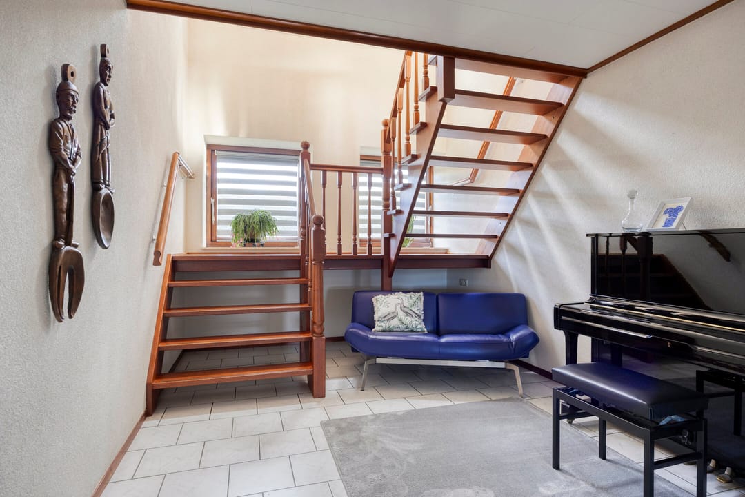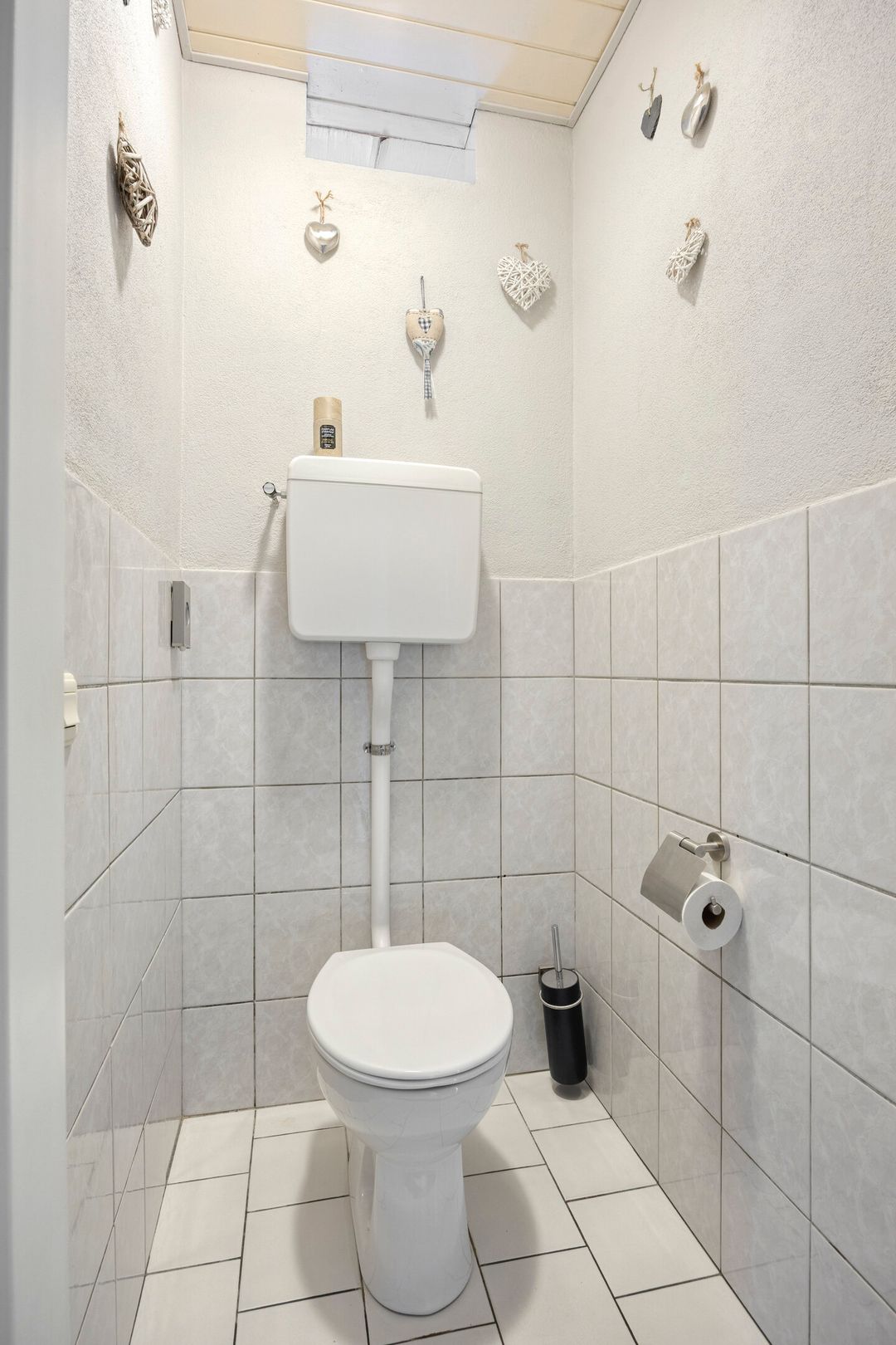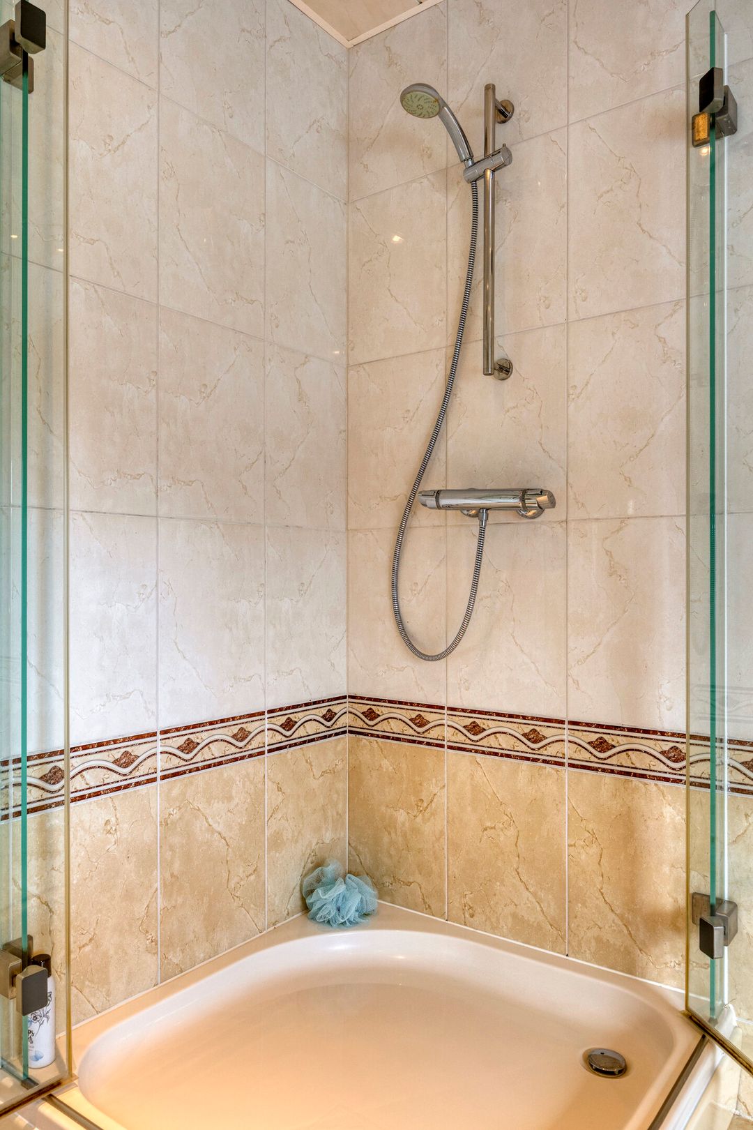 Begane grond: De stijlvolle keuken is uitgerust met kersenhouten fronten, een composiet aanrechtblad met 1,5 spoelbak en Quooker-kraan, een 5-pits inductiekookplaat met afzuigkap op het kookeiland, een koelkast en Miele-apparatuur, waaronder een stoomoven, oven en vaatwasser. Het plafond is voorzien van inbouwspots. Via de openslaande tuindeuren bereik je de lichte serre/overkapping met aluminium puien, automatische zonwering en schuifpuien. Vanuit het fraai betegelde terras geniet je van een prachtig uitzicht over de tuin en bossen. De woonkamer is ingericht met tegelvloer en gestucte wanden en plafonds, voorzien van stijlvolle sierlijsten en ornamenten. Ook hier is er directe toegang tot het terras middels een schuifpui. De centrale gang, deels voorzien van kamerhoge kastenwanden, biedt toegang tot de trappenhal naar de verdieping, de masterbedroom en de garage. Via een overkapping aan de buitenzijde bereik je de entree (met wastafel), die op haar beurt toegang biedt tot de centrale gang, de keuken, het toilet en de werkkamer. De zeer ruime masterbedroom beschikt over airconditioning en een display voor bediening van de WTW-installatie. De kamer is voorzien van een wastafelmeubel en inbouwspots in het plafond. In de garage met sectionaaldeur bevinden zich de WTW-installatie, witgoedaansluitingen en een gootsteen. Via de buitenzijde bereik je een tweede geheel betegelde toiletruimte met staand closet en urinoir. De ruime werkkamer kan ook uitstekend dienstdoen als extra slaapkamer op de begane grond en heeft een aangrenzende, volledig betegelde badkamer met douche en een separaat toilet.