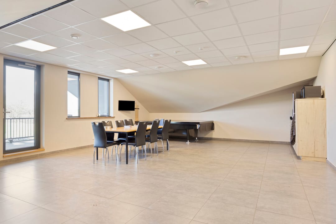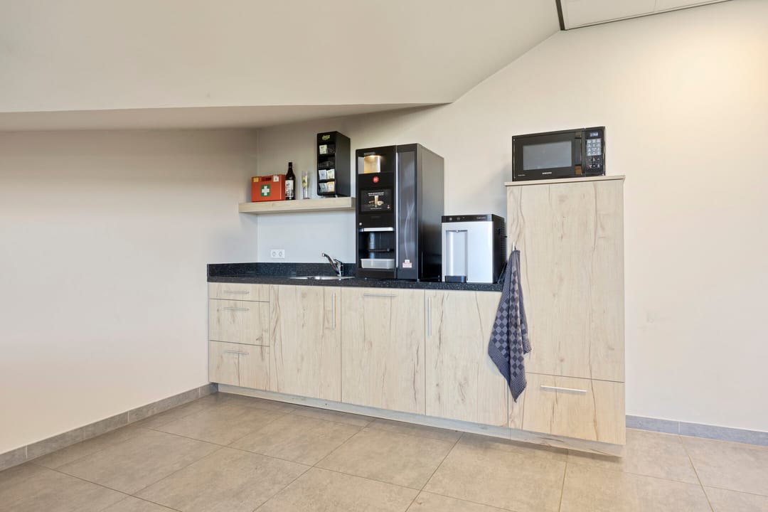Indeling verdieping: Kantine met vloerverwarming, keukenblok met koelkast en terrasdeur naar ruim balkon met prachtig weids uitzicht. Magazijn met opslag, omvormers en elektrische overheaddeur op hoogte naar de loods.