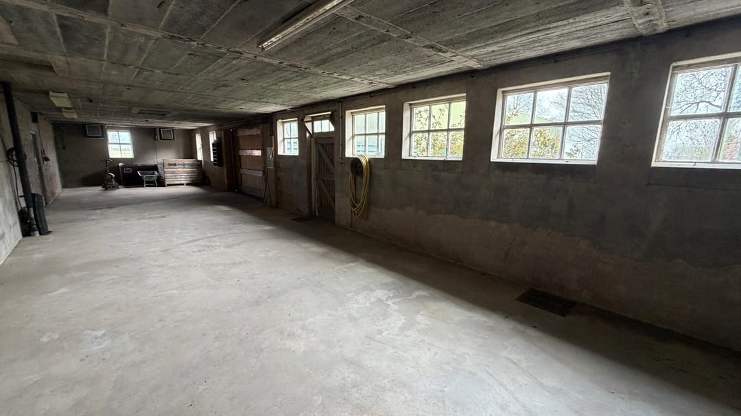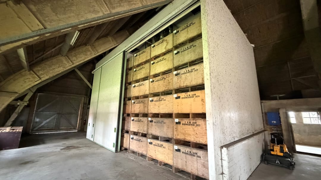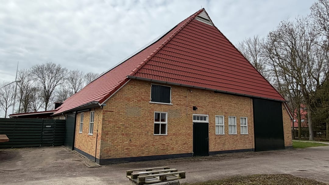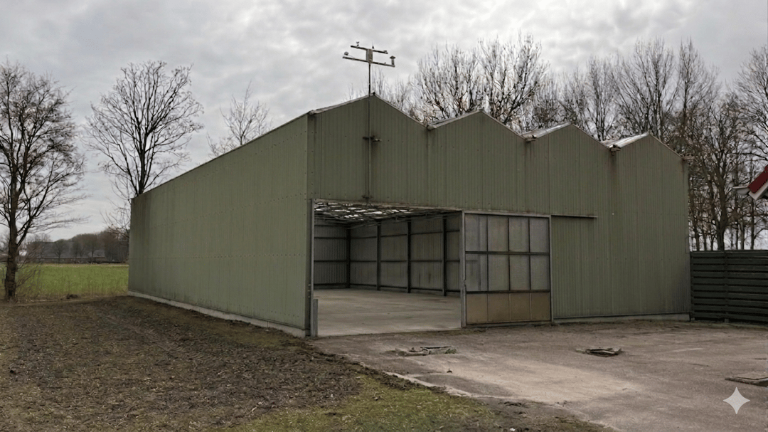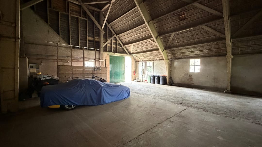 De domeinenschuur (ca. 1936, herbouwd) is ingericht als opslag- en werktuigenberging met een toegangsdeur van 4 × 4 meter. Bijzonder waardevol zijn de twee werkende koelcellen (± 77 m²), ideaal voor bloembollen, pootaardappelen of uien. Op het dak liggen 44 zonnepanelen (2014, 12,76 kWp) — ruim voldoende voor eigen verbruik.