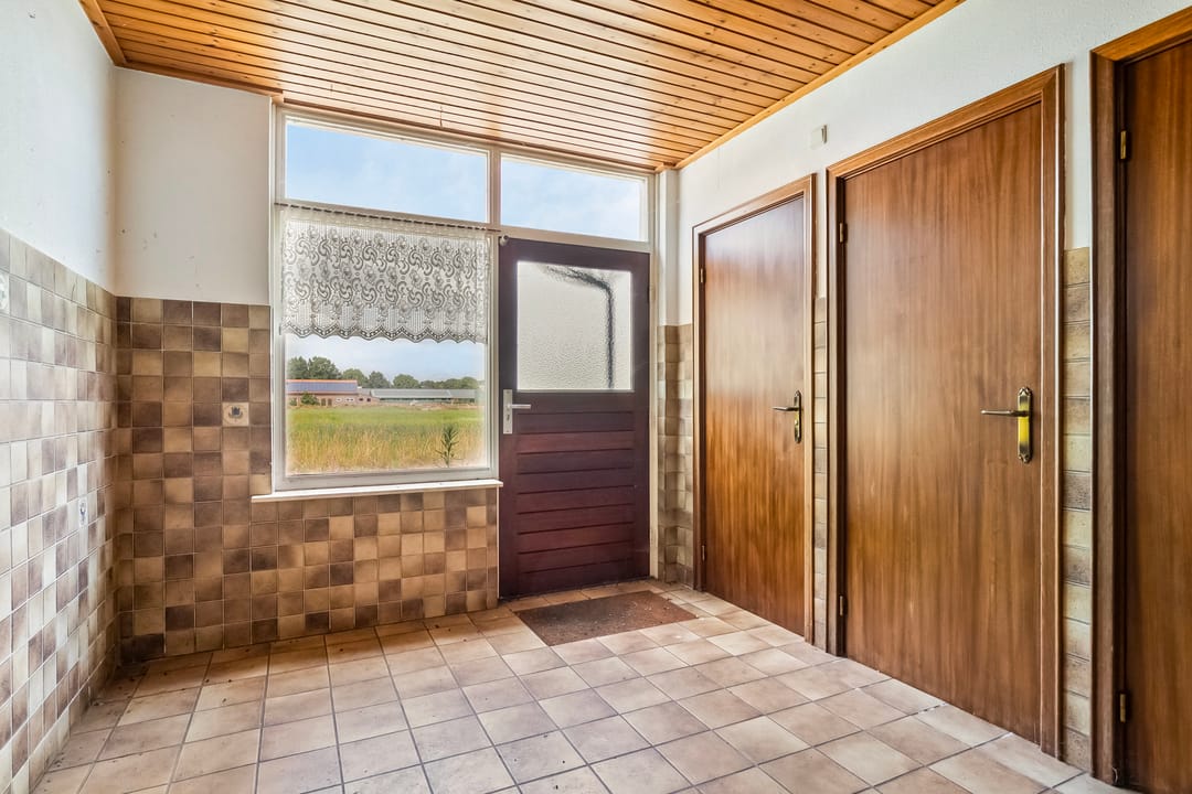 De achterentree is afgewerkt met dezelfde tegelvloer als in de keuken en entree van de woning. De muur is tevens half betegeld en het plafond bestaat uit houten schrootjes. Vanuit hier is er toegang tot een geheel betegeld toilet met zwevend closet en fonteinje. Verder is de meterkast gesitueerd in een muurkast en is er vanuit deze achterentree toegang tot de badkamer en een ruime berging (bedrijfsgedeelte).