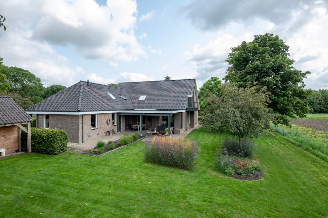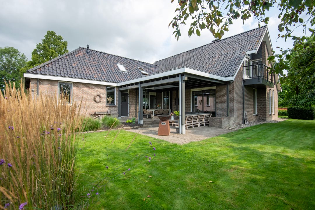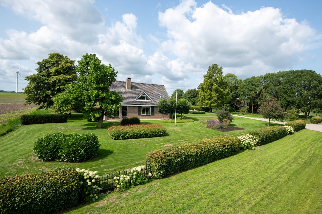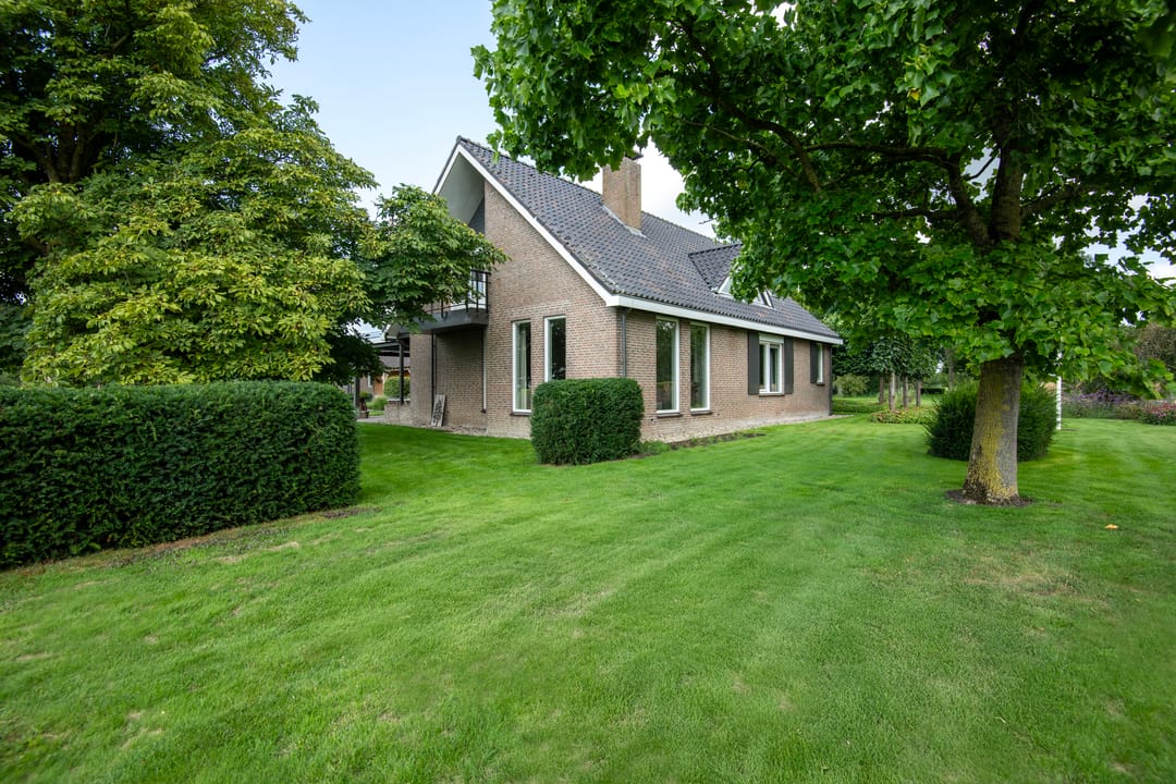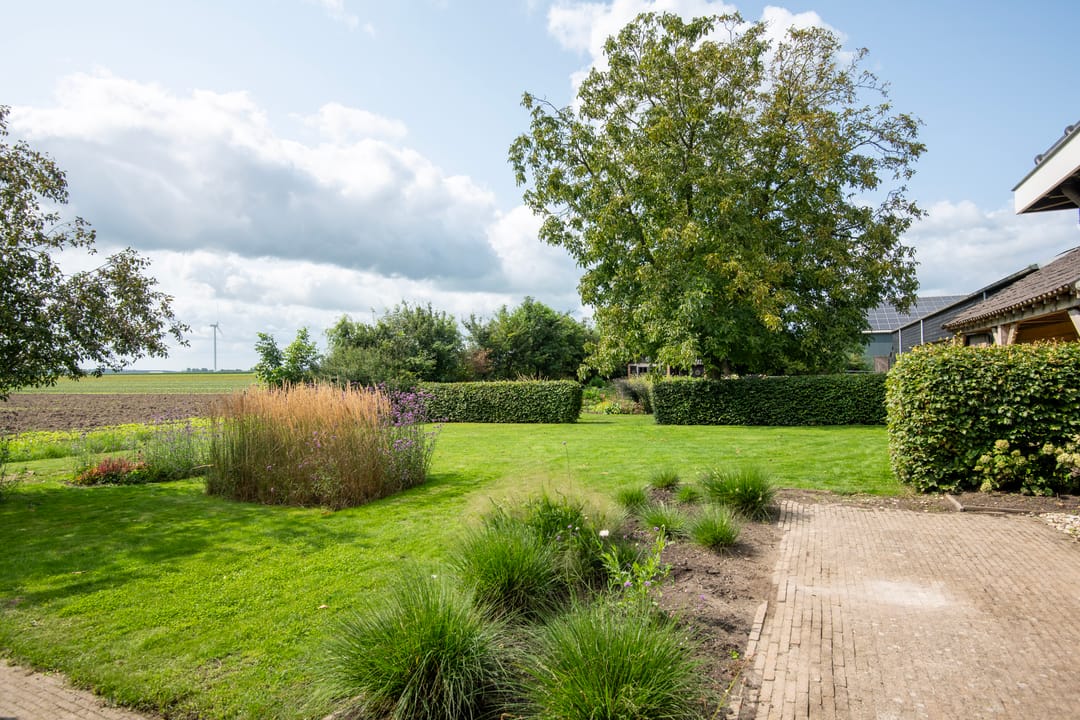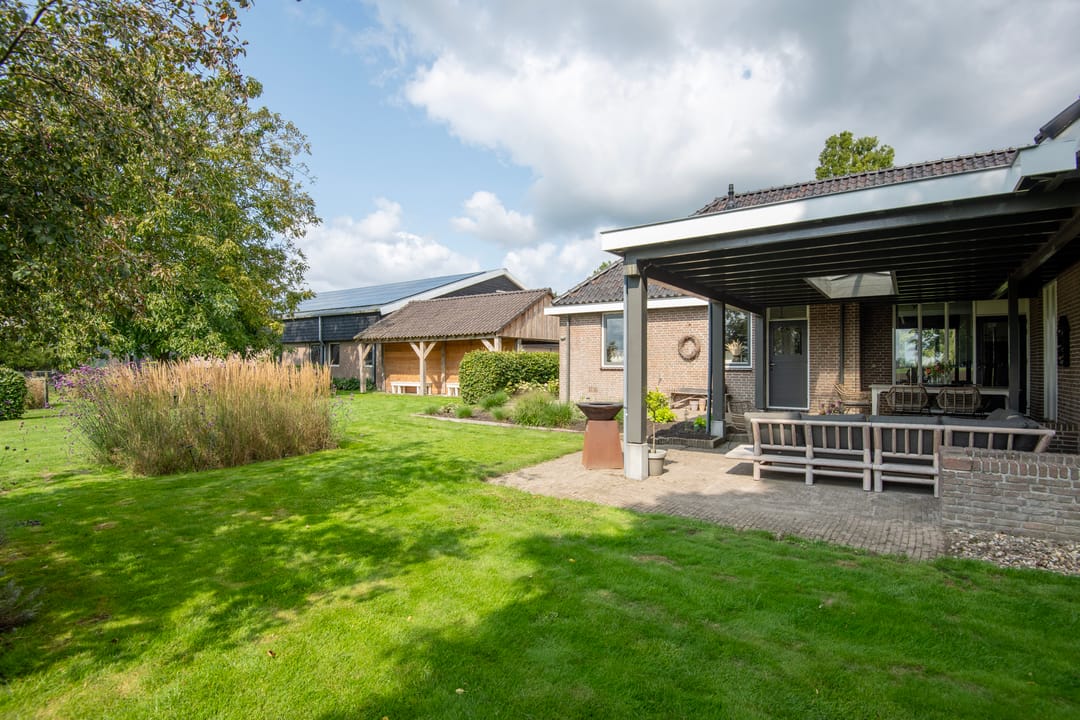 Rondom de woning ligt een mooie, verzorgde tuin met borders, beukenhagen en een keurig gazon. Enkele bomen sieren tuin en erf. Naast de moestuin bevindt zich een fraai zwart gepotdekseld tuinhuis met een oppervlakte van ca. 27 m². Het samengestelde dak met wolfseinde is gedekt met pannen.