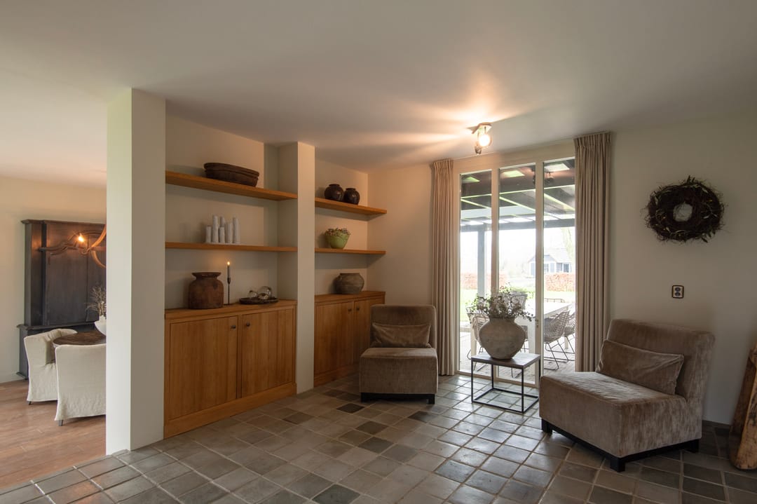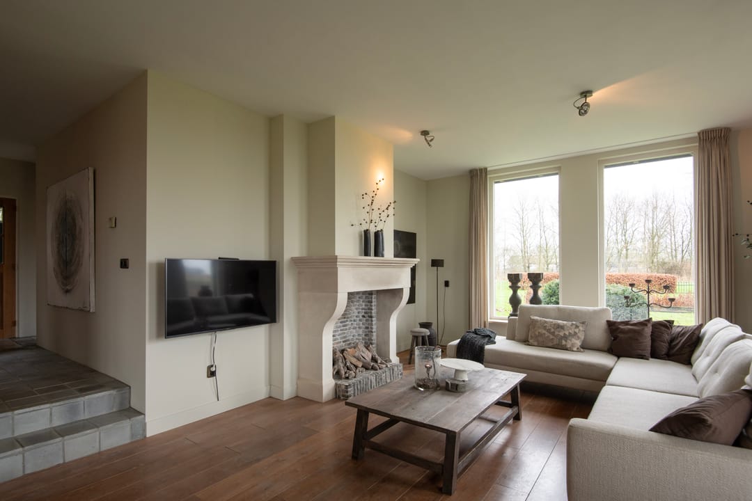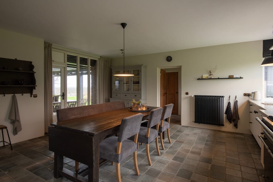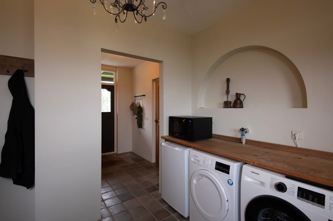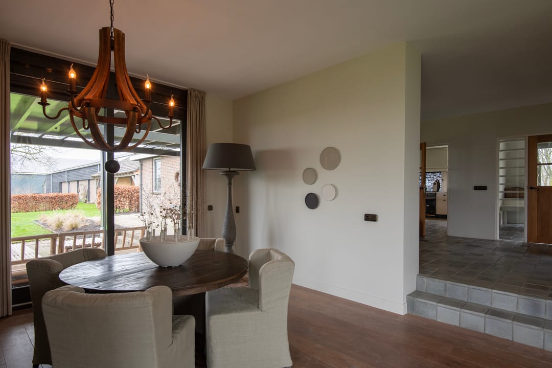 Bij binnenkomst van de woning wordt u verwelkomd in een ruime entreehal met vide, waar zich de meterkast, de trap naar de eerste verdieping en de toiletruimte bevinden. De woonkamer is bijzonder licht dankzij de royale raampartijen en is voorzien van een stijlvolle houten vloer en een schouw met open haard. De woonkamer ligt twee tredes lager dan de rest van de woning, wat een aangename, ruimtelijke sfeer creëert. Via een aparte hal bereikt u de landelijke keuken, die is uitgerust met een karakteristiek Lacanche gasfornuis met dubbele oven en diverse inbouwapparatuur, waaronder een vaatwasser en koelkast. Vanuit de keuken stapt u zo op de veranda, waar u kunt genieten van het buitenleven. Op de begane grond bevindt zich tevens een fijne slaapkamer, voorzien van een luxe parket vloer, en een en-suite badruimte met wastafel, ligbad en inloopdouche. De bijkeuken is praktisch ingericht met een garderobe en aansluitingen voor wasmachine en droger, en biedt eveneens toegang tot de veranda, inpandige garage en de tuin.