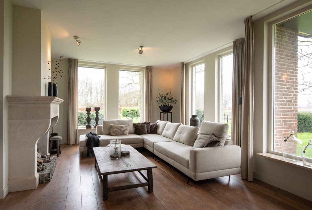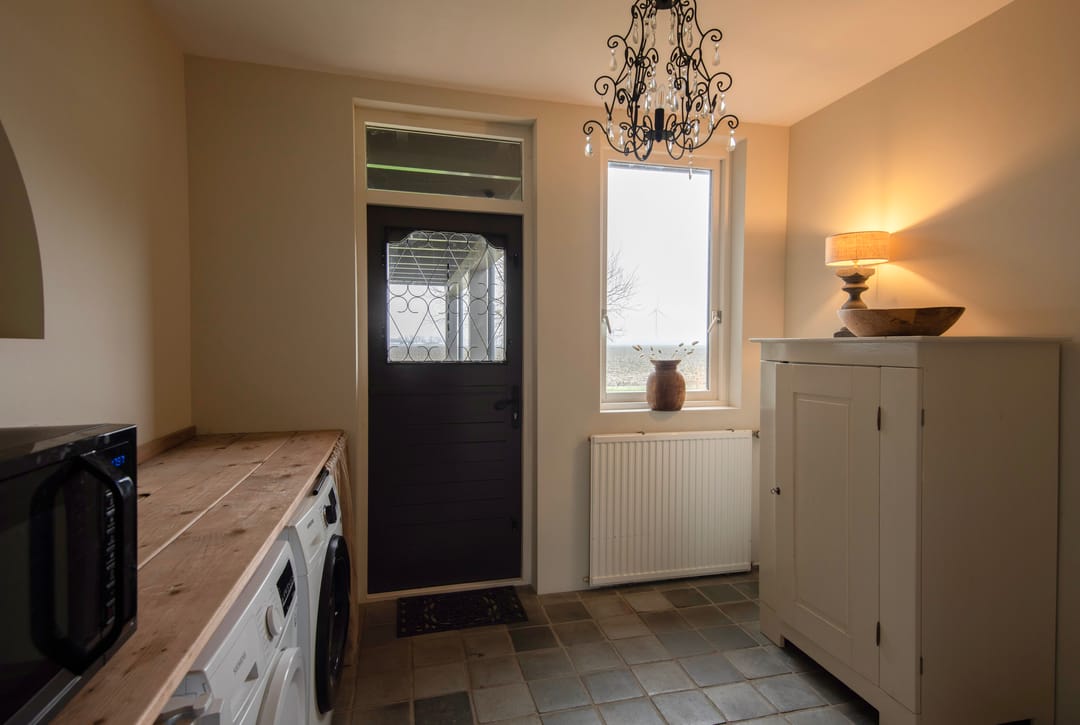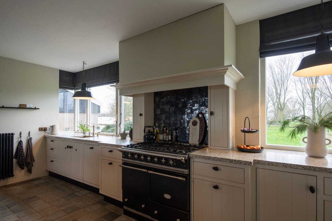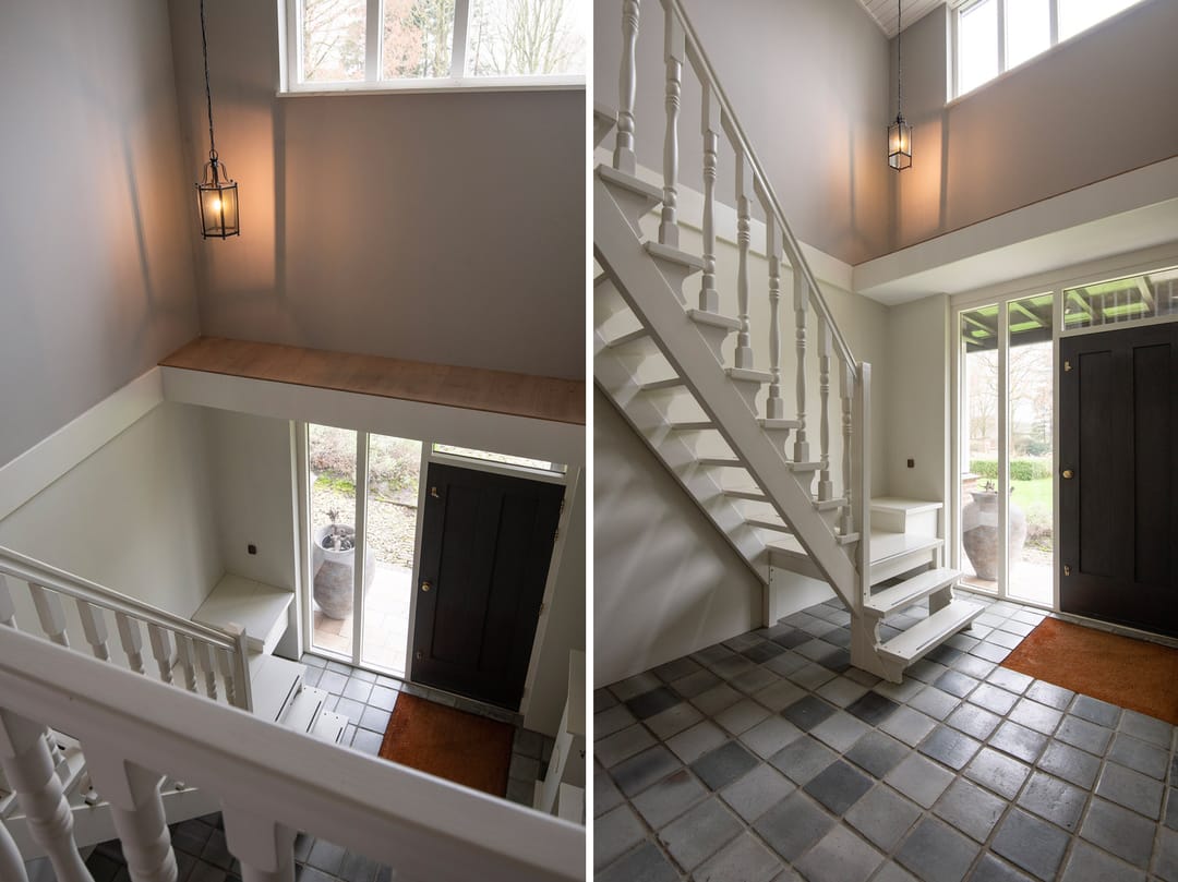 Bij binnenkomst van de woning wordt u verwelkomd in een ruime entreehal met vide, waar zich de meterkast, de trap naar de eerste verdieping en de toiletruimte bevinden. De woonkamer is bijzonder licht dankzij de royale raampartijen en is voorzien van een stijlvolle houten vloer en een schouw met open haard. De woonkamer ligt twee tredes lager dan de rest van de woning, wat een aangename, ruimtelijke sfeer creëert. Via een aparte hal bereikt u de landelijke keuken, die is uitgerust met een karakteristiek Lacanche gasfornuis met dubbele oven en diverse inbouwapparatuur, waaronder een vaatwasser en koelkast. Vanuit de keuken stapt u zo op de veranda, waar u kunt genieten van het buitenleven. Op de begane grond bevindt zich tevens een fijne slaapkamer, voorzien van een luxe parket vloer, en een en-suite badruimte met wastafel, ligbad en inloopdouche. De bijkeuken is praktisch ingericht met een garderobe en aansluitingen voor wasmachine en droger, en biedt eveneens toegang tot de veranda, inpandige garage en de tuin.
