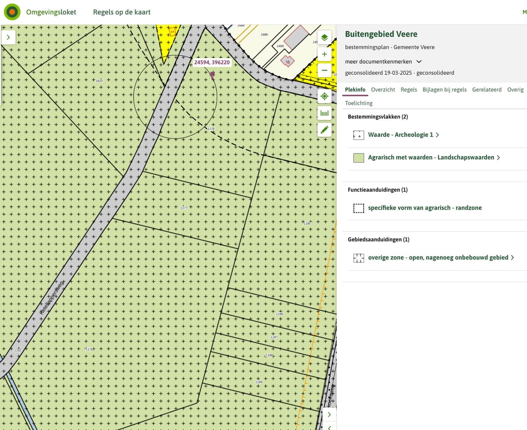 Op het perceel is van toepassing het Omgevingsplan gemeente Veere (vastgesteld d.d 21-03-2025), waarop van toepassing het bestemmingsplan Buitengebied, gemeente Veere, vastgesteld 9-03-2025 – geconsolideerd.