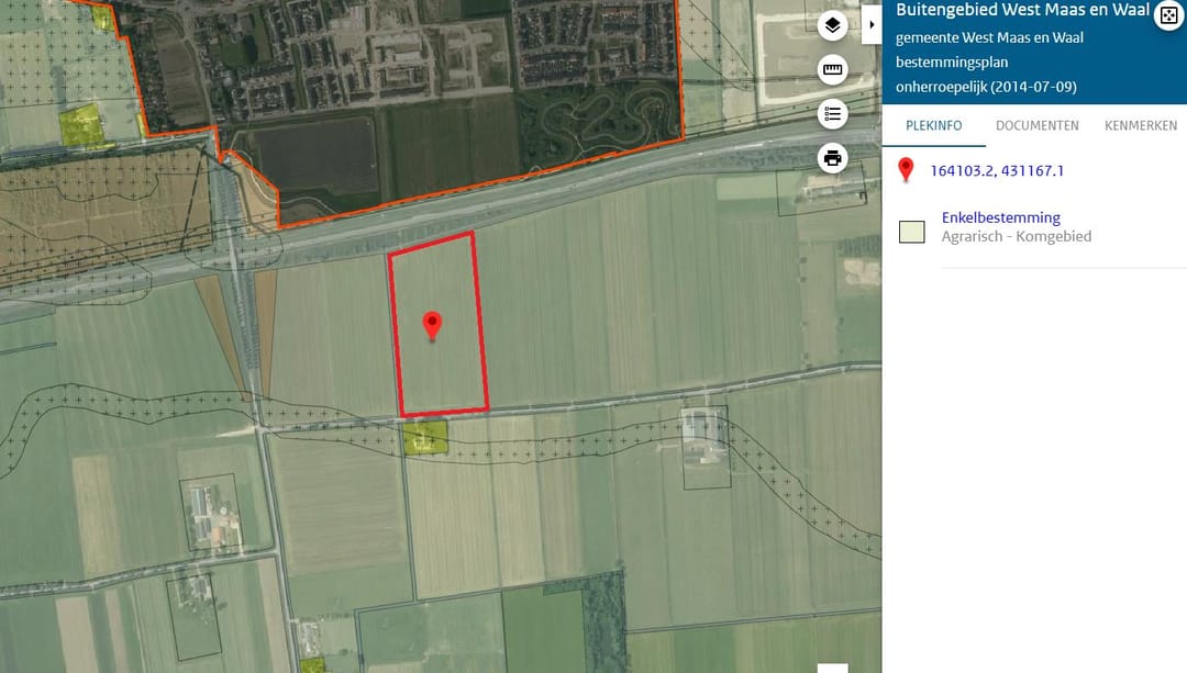 Volgens het bestemmingsplan Buitengebied West Maas en Waal (onherroepelijk 9 juli 2014) rust op het perceel de enkelbestemming Agrarisch – Komgebied. Geen dubbelbestemmingen of beperkende aanduidingen.