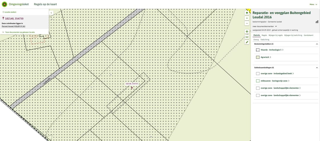 Het perceel is gelegen in het bestemmingsplan 'Reparatie- en veegplan Buitengebied Leudal 2016' van de gemeente Leudal. Binnen dit bestemmingsplan heeft het perceel de enkelbestemming 'Agrarisch', de dubbelbestemming 'Waarde - Archeologie 5' en de gebiedsaanduidingen 'Overige zone - invloedsgebied beek', 'Milieuzone - boringsvrije zone' en 'Overige zone - landschappelijke elementen'.