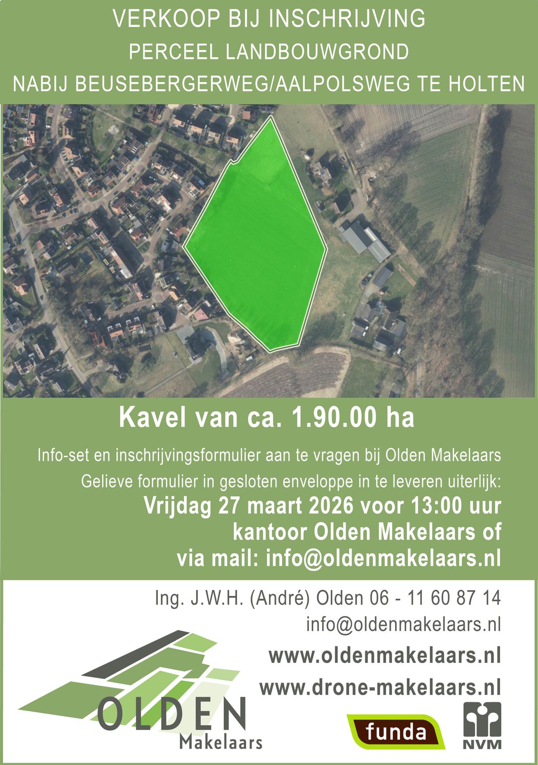 Inschrijfformulier met bieding dient uiterlijk vrijdag 27 maart 2026 voor 13:00 uur ingeleverd te worden in een gesloten enveloppe bij Olden Makelaars (persoonlijk of brievenbus) of via mail naar