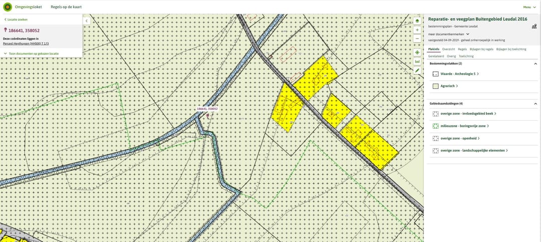 Het perceel is gelegen in het bestemmingsplan 'Reparatie- en veegplan Buitengebied Leudal 2016' van de gemeente Leudal. Binnen dit bestemmingsplan heeft het perceel de enkelbestemming 'Agrarisch', de dubbelbestemming 'Waarde - Archeologie 5' en de gebiedsaanduidingen 'Overige zone - invloedsgebied beek', 'Milieuzone - boringsvrije zone', 'Overige zone - openheid' en 'Overige zone - landschappelijke elementen'.