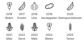 De afgelopen jaren zijn de volgende gewassen geteeld: bieten, erwten, uien, aardappelen, stampsperziebonen, maïs, gerst en tarwe.