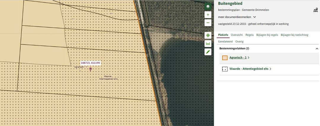 Conform het vigerende omgevingsplan ‘Buitengebied’ van de gemeente Drimmelen, heeft het perceel de bestemming ‘agrarisch-1’ en gedeeltelijk de bestemming ‘Waarde-attentiegebied ehs’.