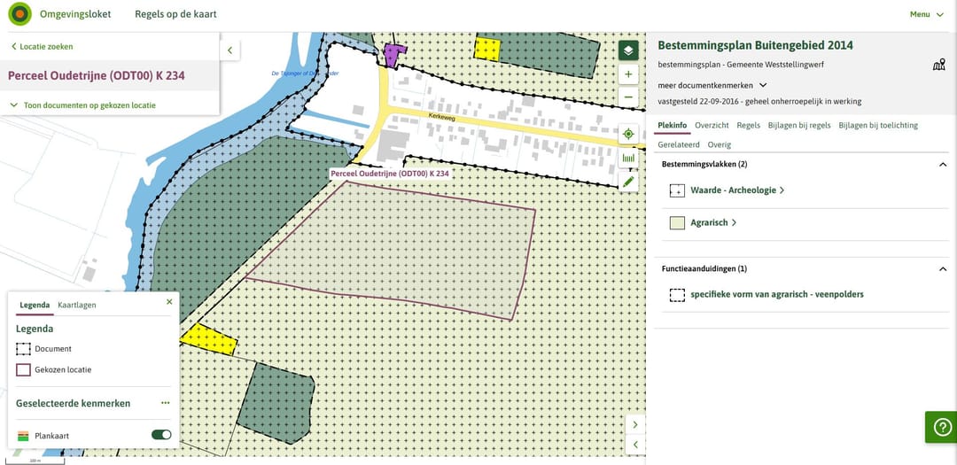 Omgevingsplan: Blijkens het omgevingsplan Bestemmingsplan Buitengebied 2014 hebben de landerijen het bestemmingsvlak Agrarisch en Waarde – Archeologie met functieaanduiding “specifieke vorm van agrarisch – veenpolders”. Zie bijlage Bestemmingsplankaart.