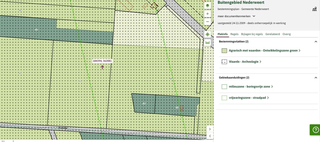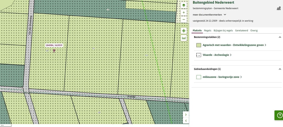 Het perceel is gelegen in het bestemmingsplan 'Buitengebied Nederweert' van de gemeente Nederweert Binnen dit bestemmingsplan heeft het perceel de enkelbestemming 'Agrarisch met waarden - Ontwikkelingszone groen' en de dubbelbestemming 'Waarde - Archeologie'.