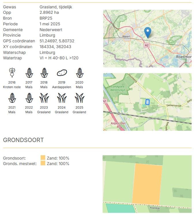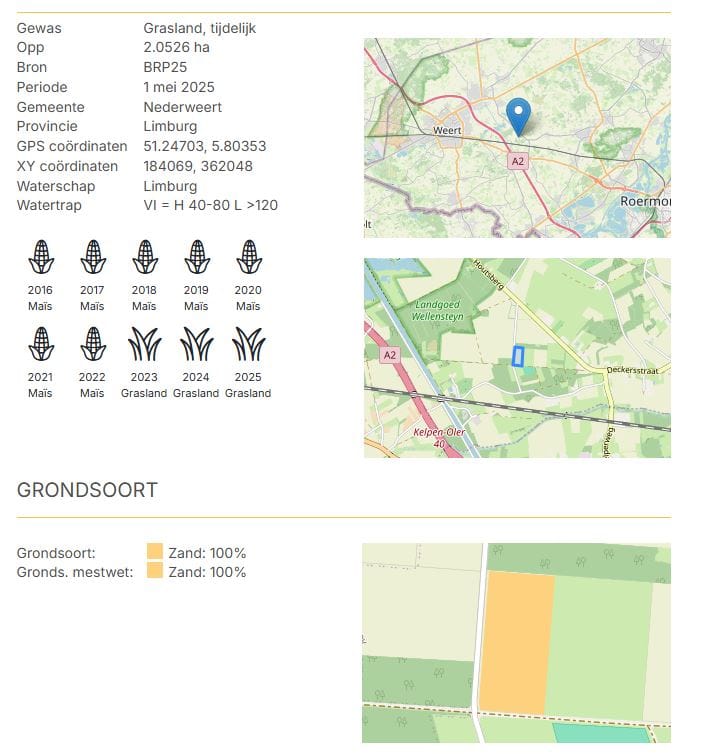 Het perceel is kadastraal bekend als gemeente Nederweert, sectie S, nummers 130 en 472, tezamen ter grootte van 5.09.50 hectare.