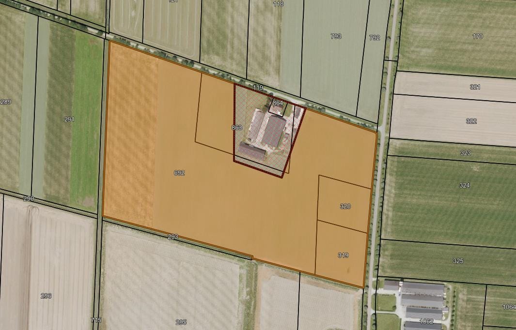 - Voorafgaand aan de inschrijfprocedure is een kadastrale splitsing opgestart om de bovengenoemde percelen kadastraal te splitsen. Daarbij zal de locatie Spapenhoefstraat 1, inclusief het onderliggende bouwblok, een eigen kadastraal nummer verkrijgen. De totale oppervlakte van het perceel dat te koop wordt aangeboden bedraagt hierdoor circa 11.11.50 hectare. Eventuele meer- of minderoppervlakte zal naar evenredigheid worden verrekend. De locatie Spapenhoefstraat 1 met ca. 1,30.00 ha. ondergrond behoord derhalve niet bij de verkoop.
