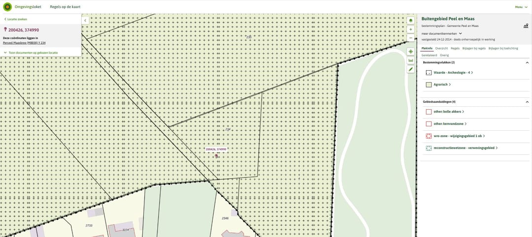 Het perceel is gelegen in het bestemmingsplan 'Buitengebied Peel en Maas' van de gemeente Peel en Maas. Binnen dit bestemmingsplan heeft het perceel de enkelbestemming 'Agrarisch', de dubbelbestemming 'Waarde - Archeologie - 4' en de gebiedsaanduidingen 'other: bolle akkers', 'other: kernrandzone', 'wro-zone - wijzigingsgebied 1 ob' en 'reconstructiewetzone - verwevingsgebied'.
