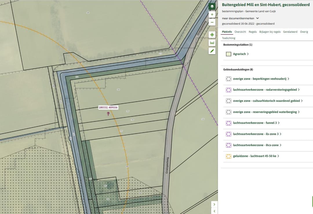 De bestemming is agrarisch, met onder andere de gebiedsaanduidingen 'overige zone - cultuurhistorisch waardevol gebied' en 'overige zone - reserveringsgebied waterberging'. Een weergave uit het omgevingsloket vindt u in de brochure.
