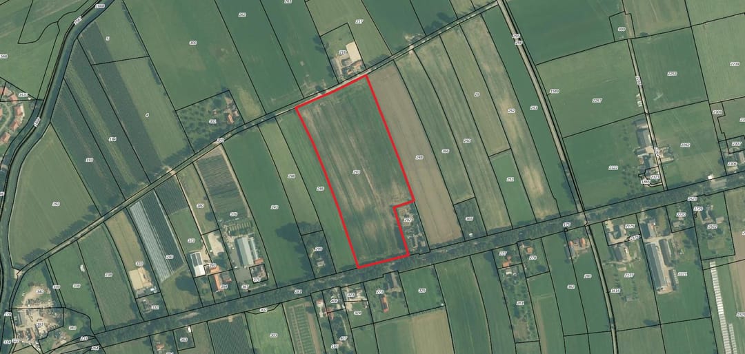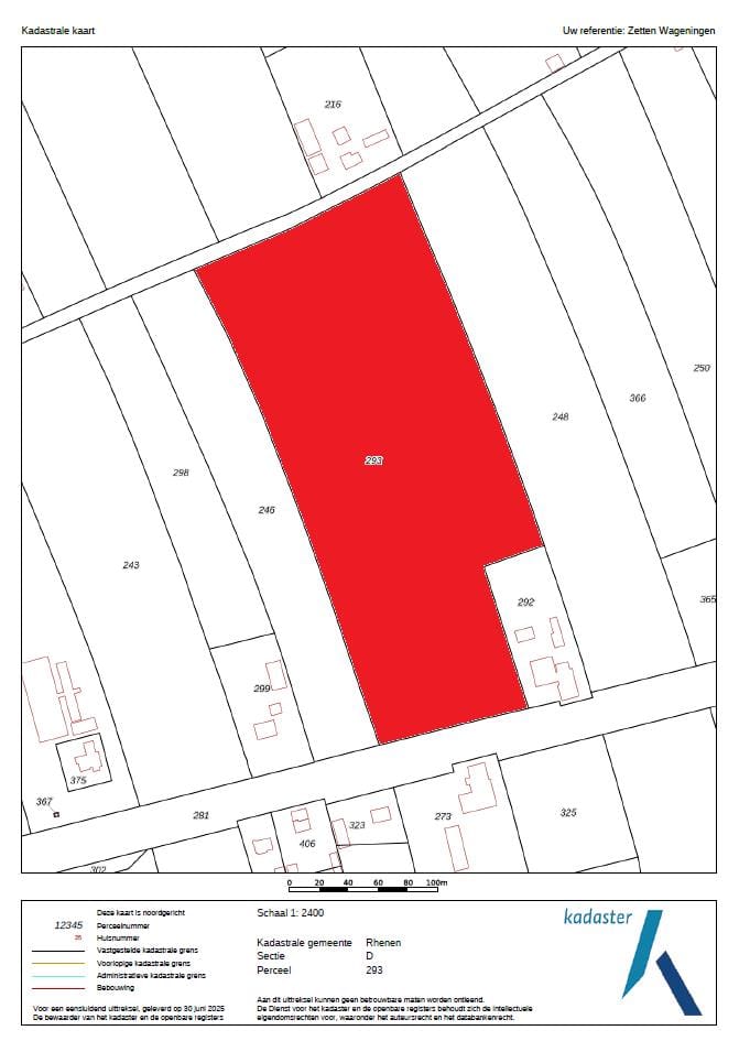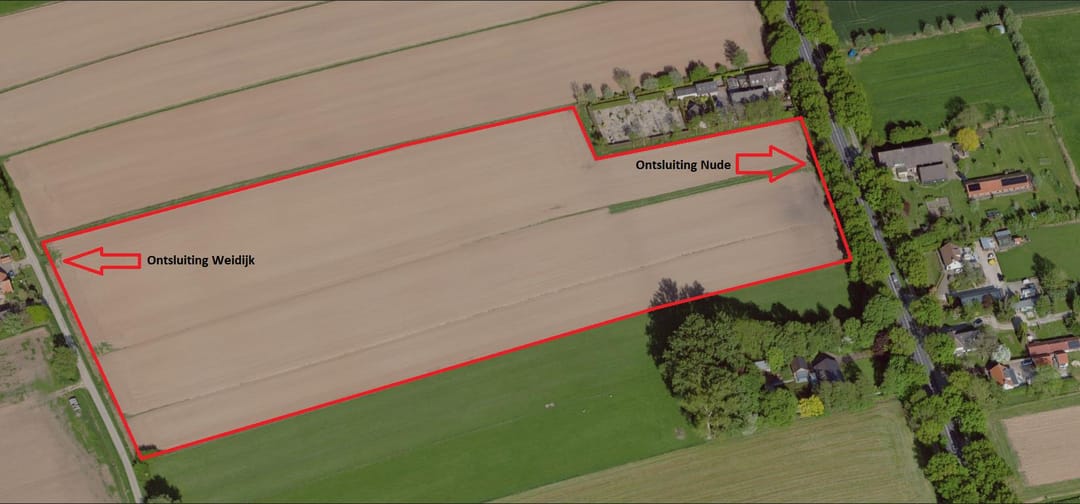 Betreft een aaneengesloten kavel grond met een oppervlakte van 49.440 m2 (4.94.40 ha.), gelegen aan de Nude te Rhenen, kadastraal bekend als Rhenen sectie D nummer 293. De kavel beschikt over een directe ontsluiting op zowel de Nude als de Weidijk en strekt zich vanaf de Nude in noordelijke richting uit over een gemiddelde diepte van circa 350 meter tot aan de Weidijk. De kavel wordt aan de noord-, oost- en zuidzijde begrensd door een watergang. Blijkens de kadastrale kaart komt de feitelijke meest westelijk gelegen kavelgrens niet geheel overeen met de kadastrale grens.