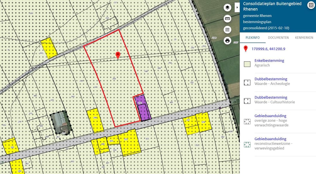 De kavel is gelegen in het buitengebied van Rhenen/Wageningen, gemeente Rhenen. Krachtens het vigerende bestemmingsplan "Consolidatieplan Buitengebied Rhenen", vastgesteld door de gemeenteraad op 10 februari 2015, heeft de kavel de navolgende bestemming: