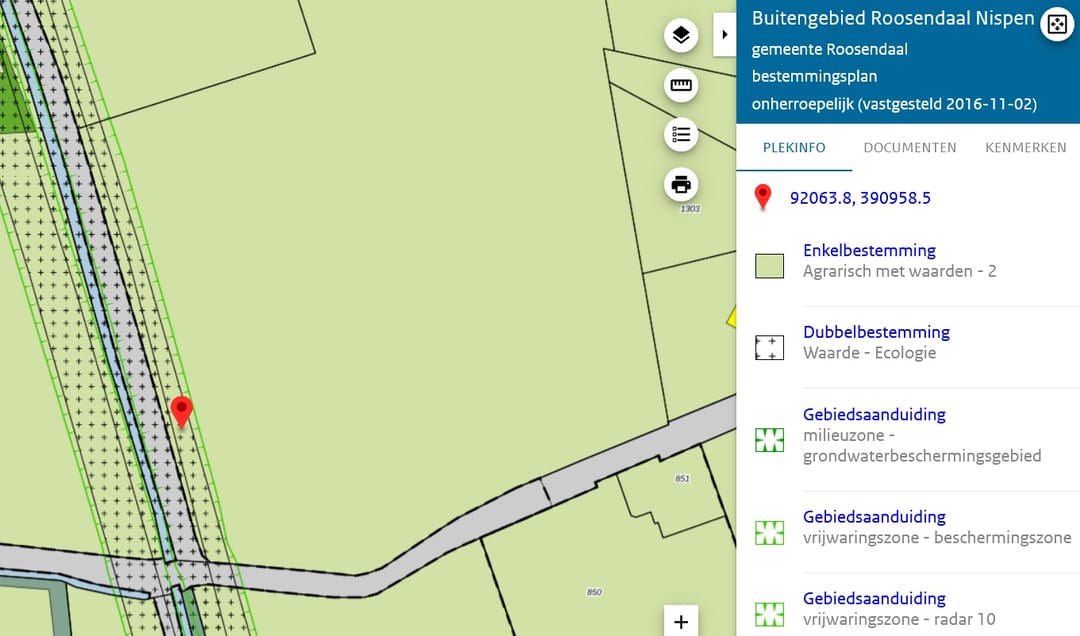 De groenstrook / bomenrij heeft de enkelbestemming "Agrarisch met waarden -2" en de dubbelbestemming "Waarde - ecologie" met een gebiedsaanduiding "milieuzone - grondwaterbeschermingsgebied, een gebiedsaanduiding "vrijwaringszone - beschermingszone" en een gebiedsaanduiding : vrijwaringzone - radar 10".