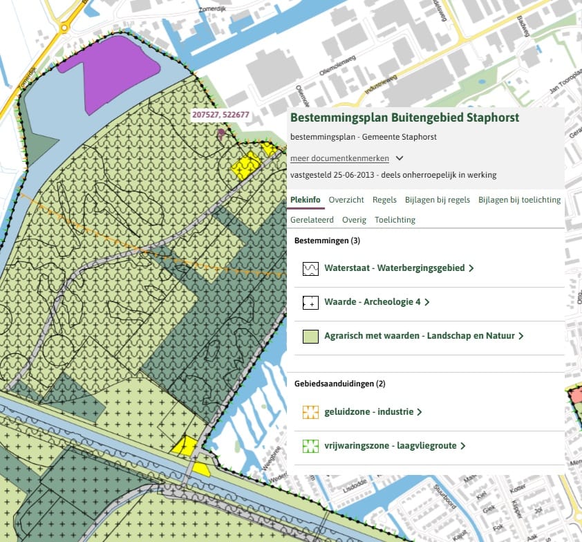 Bestemmingsplan: Enkelbestemming Agrarisch met waarden – Landschap en Natuur, waterstaat – waterbergingsgebied, waarde -archeologie 4, Gebiedsaanduiding geluidzonde – industrie en vrijwaringszone - laagvliegroute
